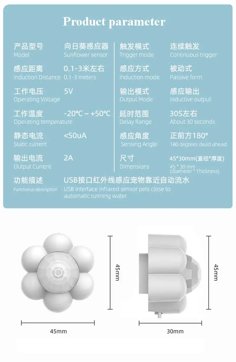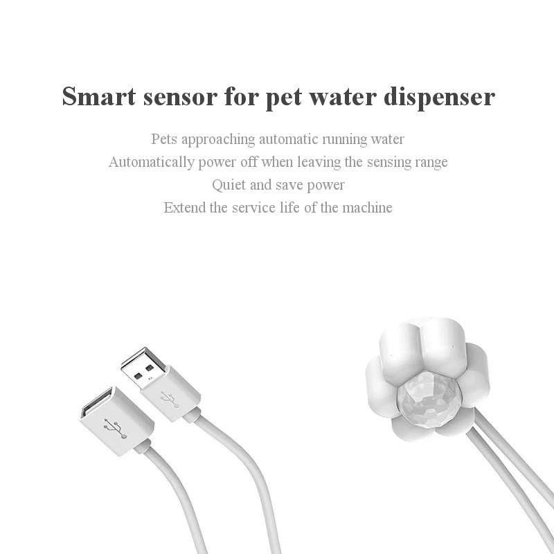 Описание умной индукционной функции:1. Автоматическое включение проточной воды при приближении питомца, оставьте диапазон срабатывания 2-3 метра, фильтр в течение 30 секунд, а затем автоматически Встаньте;2. Преимущества: бесшумный, энергосберегающий, продлевает срок службы фильтрующего элемента и водяного насоса, и может лучше привлечь домашних животных, чтобы пить больше воды3. Индукционный диапазон: около 0,2-3 метра. Диапазон использования: любой диспенсер для воды с интерфейсом USB может использоваться d.4. Разъем USB: метод подключения USB jack для легкого подключения. Общая длина кабеля составляет 1,6 м.Инструкции:1. Вставьте usb-разъем фонтанного насоса в входной порт USB датчика.Затем вставьте usb-разъем датчика в адаптер.2. Отсасывайте датчик в одном месте. (блестящая или глянцевая гладкая поверхность)Если рядом нет домашних животных, он будет оставаться неподвижным, но он будет автоматически циклировать и фильтровать четыре раза в день, каждый saix часов, чтобы обеспечить чистую воду.Посылка включает в себя:1 х датчик (не включает диспенсер для воды)