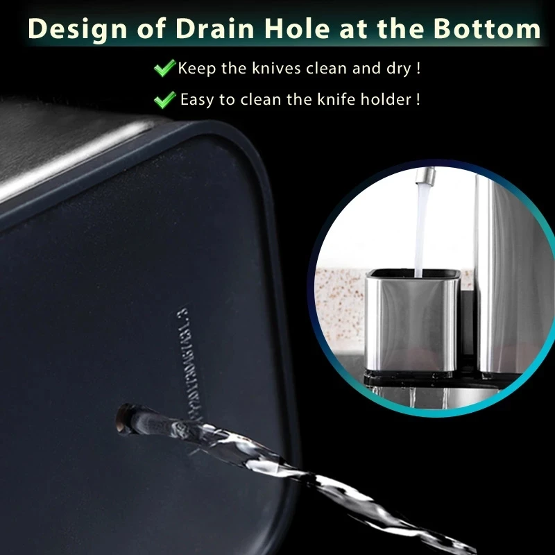 В нижней части держателя ножа и держателя посуды есть сливные отверстия. Это помогает сливать воду после того, как вы только что помыли ножи. Просто протрите поверхность из нержавеющей стали или прорезиненную подкладку, чтобы сохранить ваш нож в чистоте.