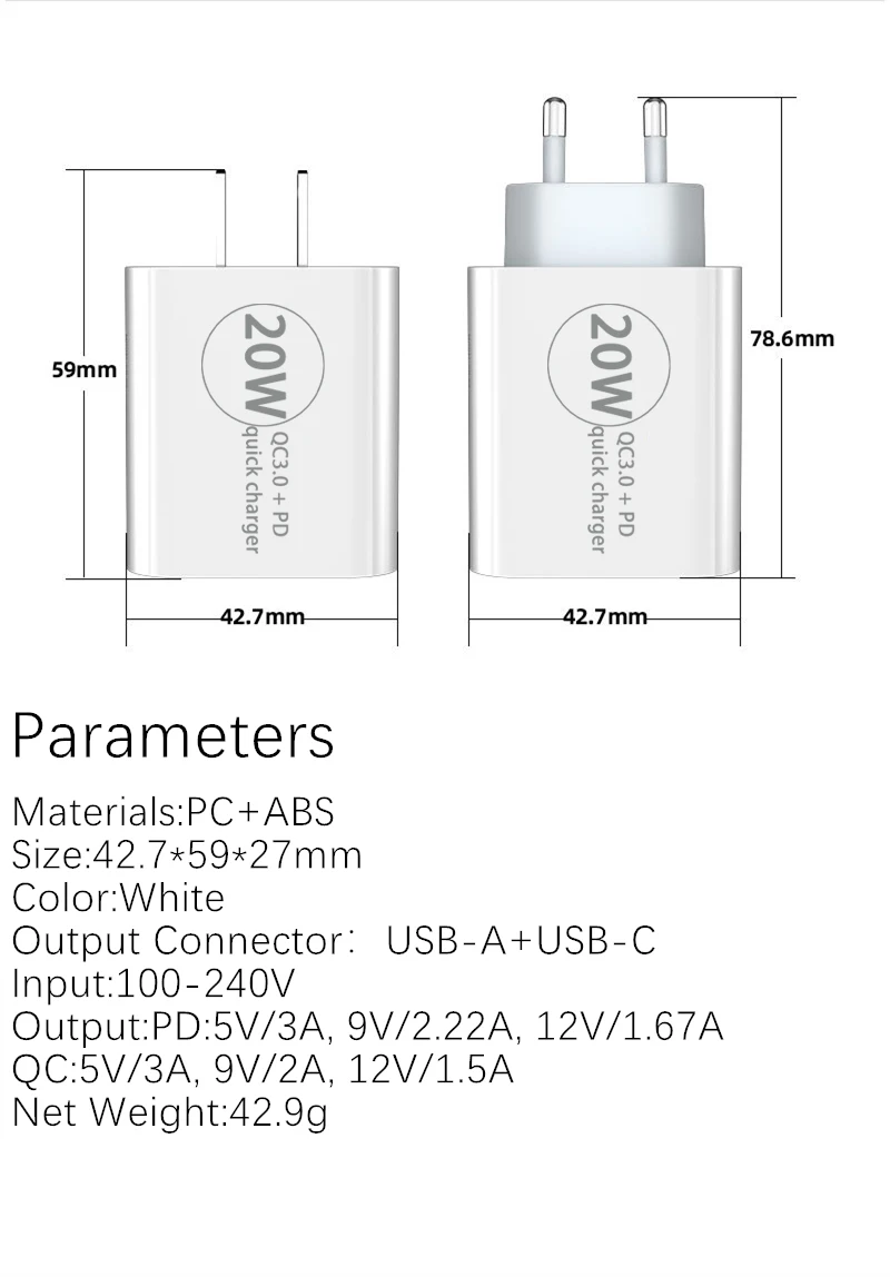 Зарядное устройство USB C PD, 20 Вт, QC Type-C порт, зарядное устро...