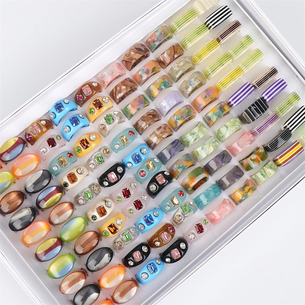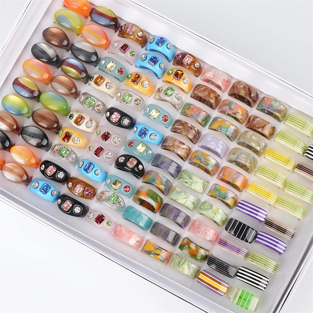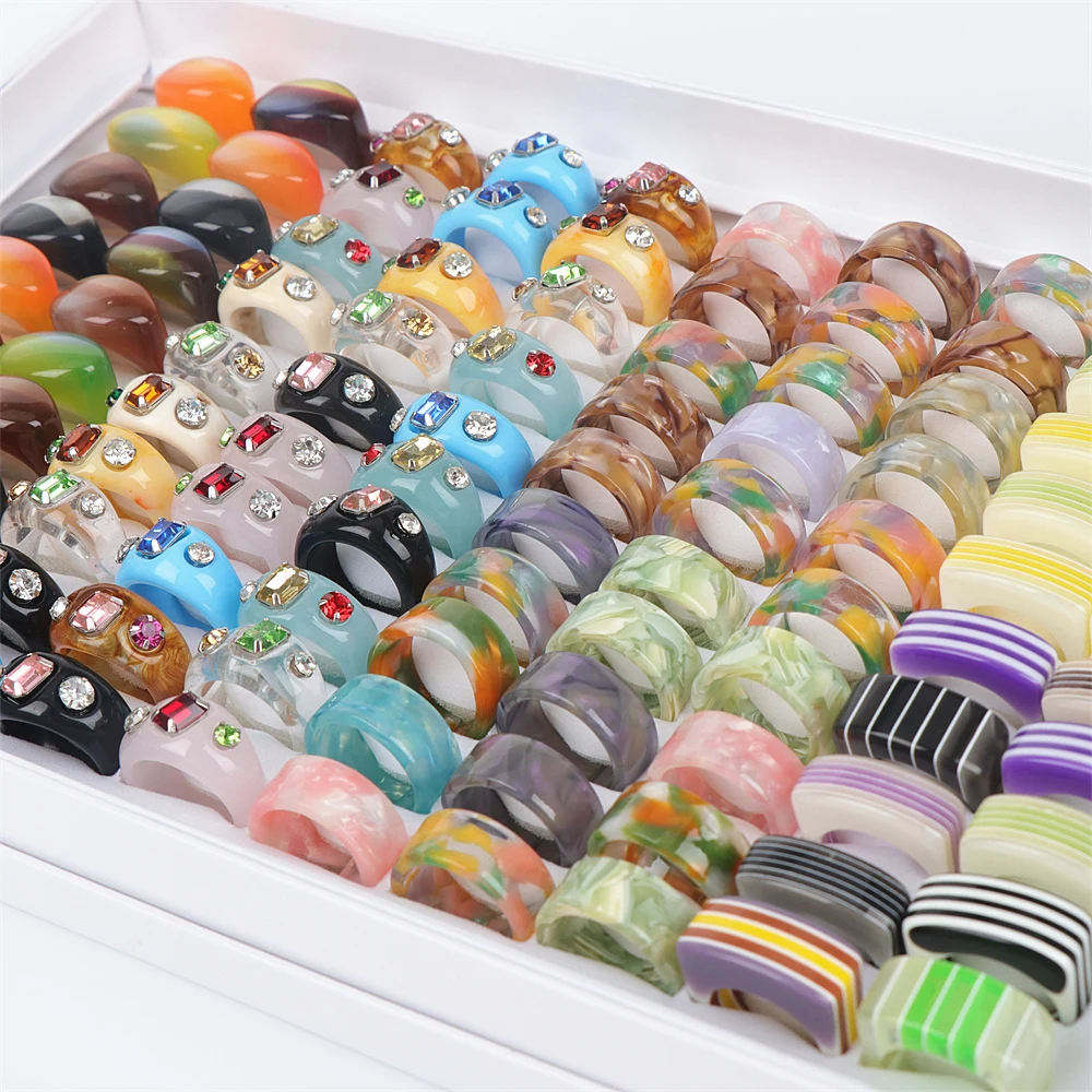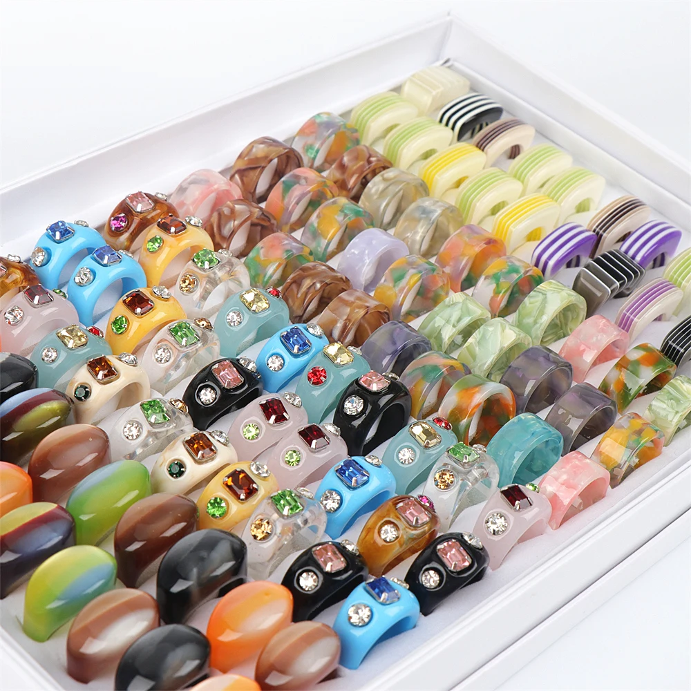 30 шт.лот модные красочные акриловые кольца со стразами из смолы, ювелирные изделия для женщин, смешанные стили, оптовая продажа