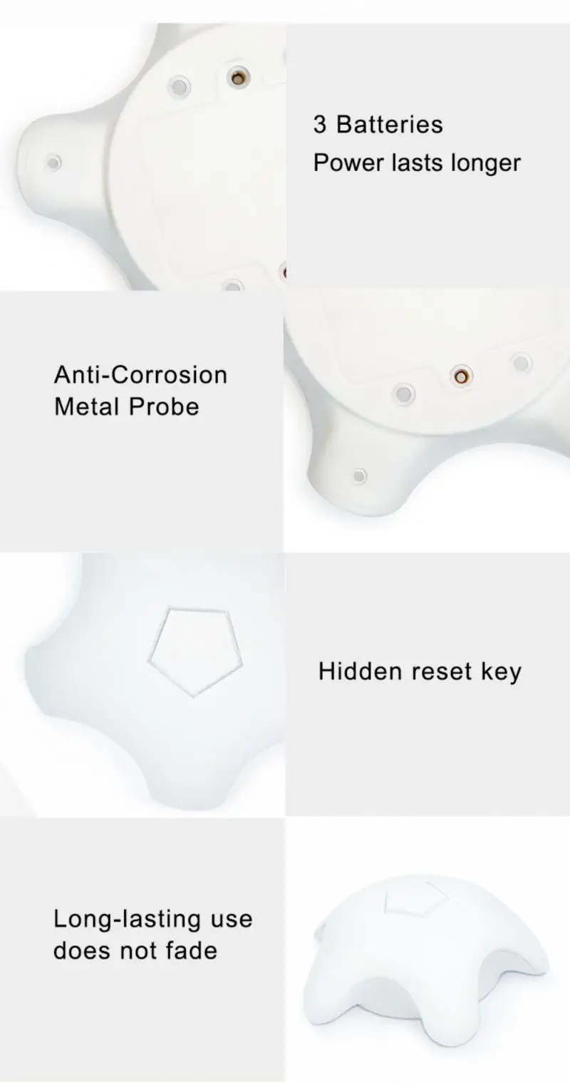 3. Используйте отвертку, чтобы открыть винт в нижней части датчика погружения воды и установить три батарейки AAA. Открыть верхнюю крышку Корпус датчика, нажмите и удерживайте в течение нескольких секунд Кнопка сброса в течение 5 секунд, а индикатор светильник быстро мигает, чтобы войти в распределительной сети.