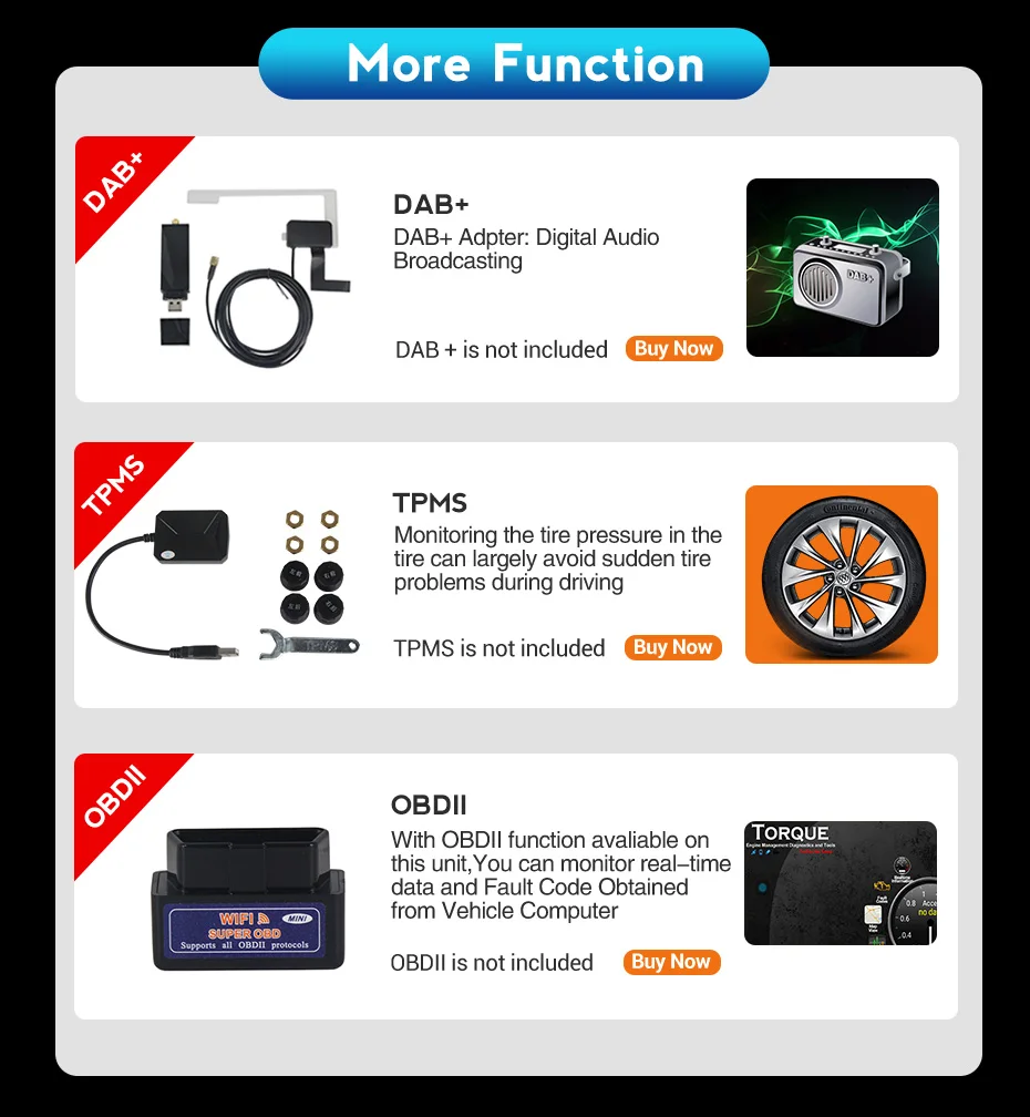 Общая функция:Управление рулевым колесом/функция камеры переднего и заднего вида/функция DVR/функция DAB/TPMS/функция сплит-экрана/настройки OBD/логотипа