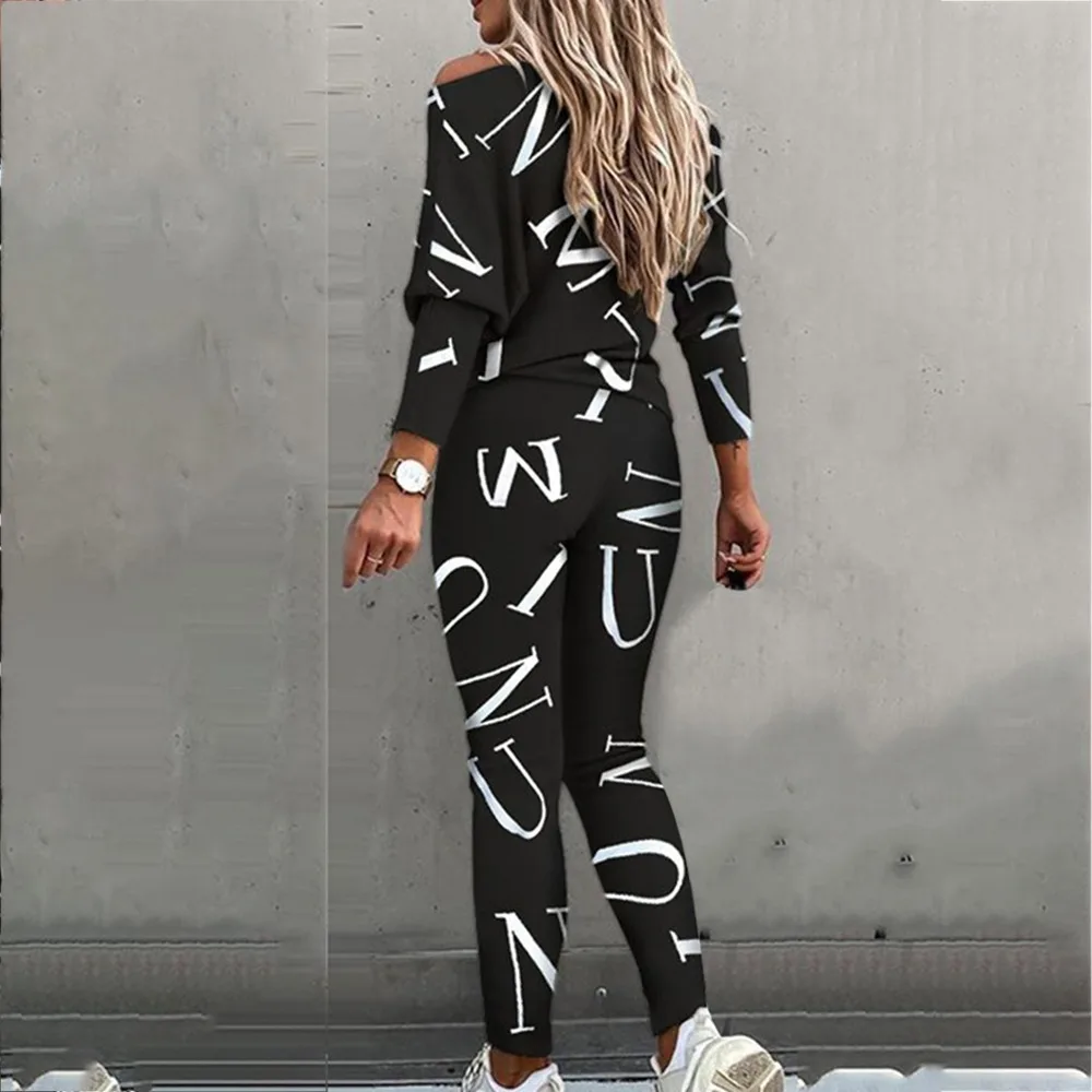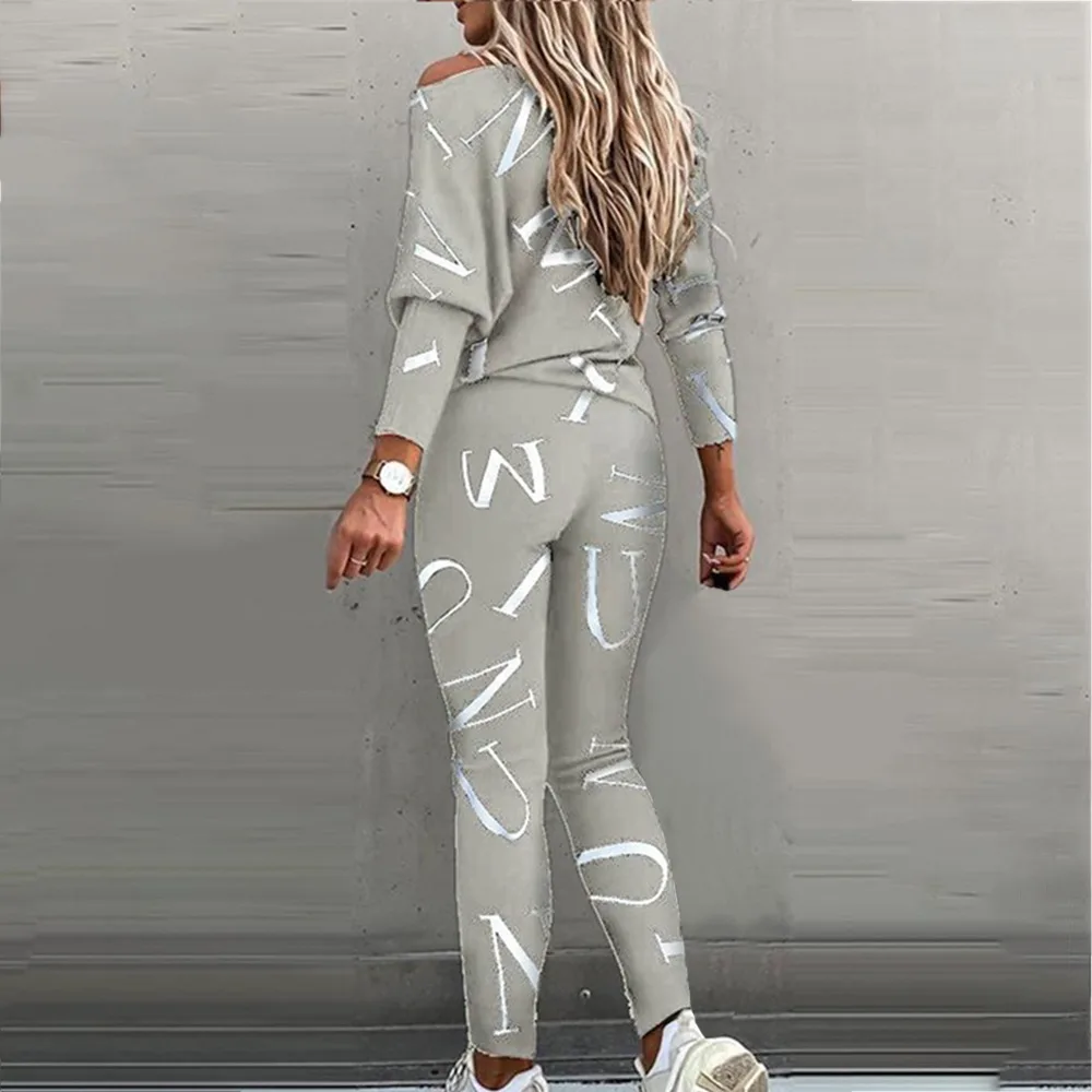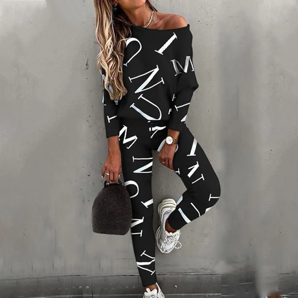 Женский спортивный костюм с буквенным принтом, топ с длинными рукавами и открытыми плечами + штаны для бега, комплект из двух предметов, спортивная одежда 2021 размера плюс