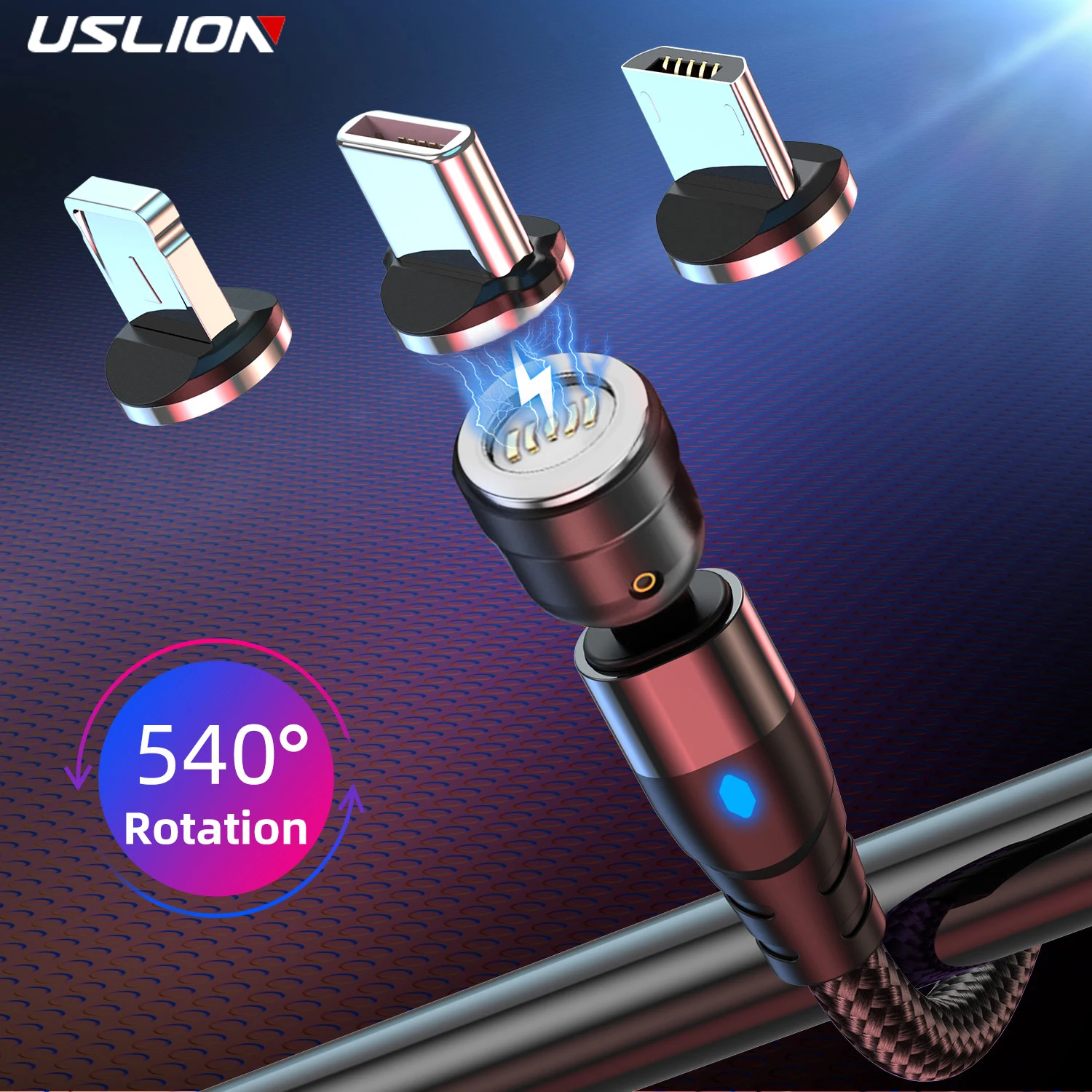 Магнитный кабель USLION, Micro USB, Type-C, для iPhone 11, 12 Pro Max, 8 Plus, XR, Samsung, Xiaomi, с поворотом на 540 градусов, 3 А