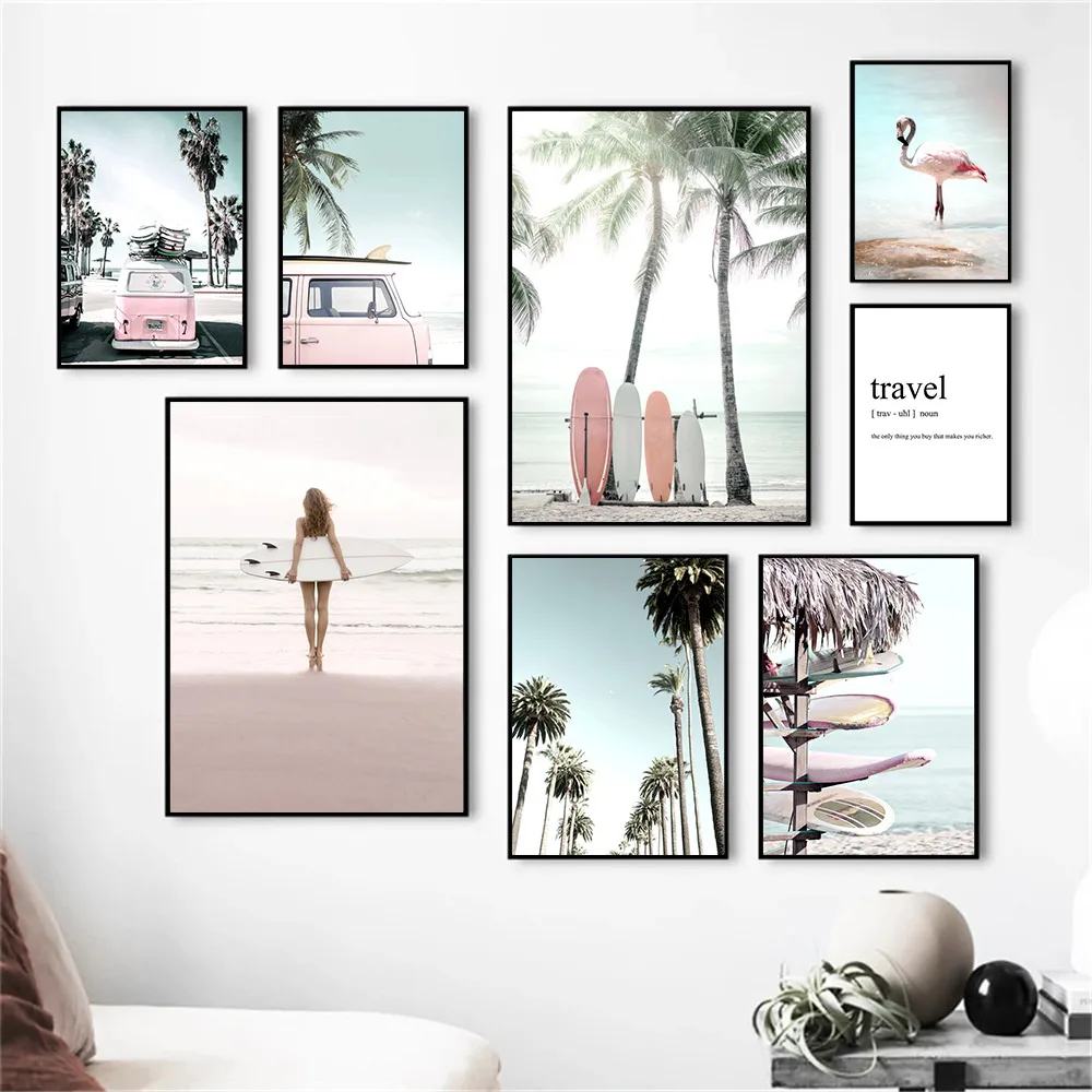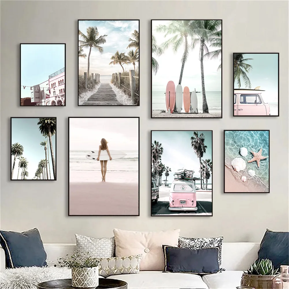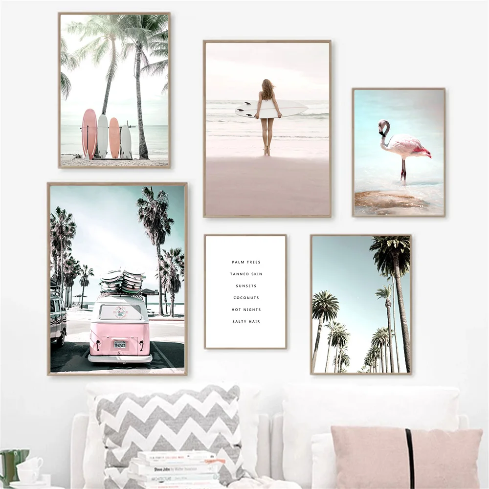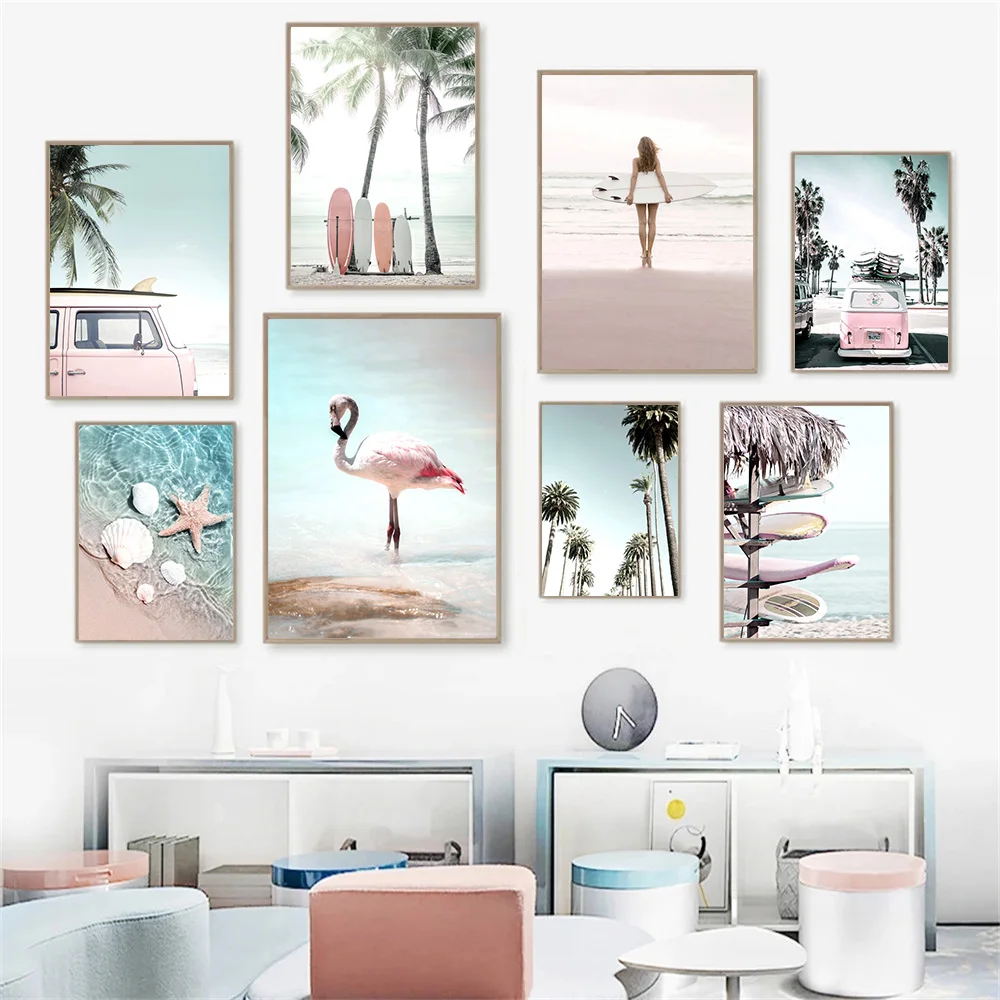 Морская звезда, ракушка, девушка для серфинга, Пляжная пальма, доска для серфинга, печать на холсте, розовый автомобиль, фламинго, настенный постер, картины, Декор для дома