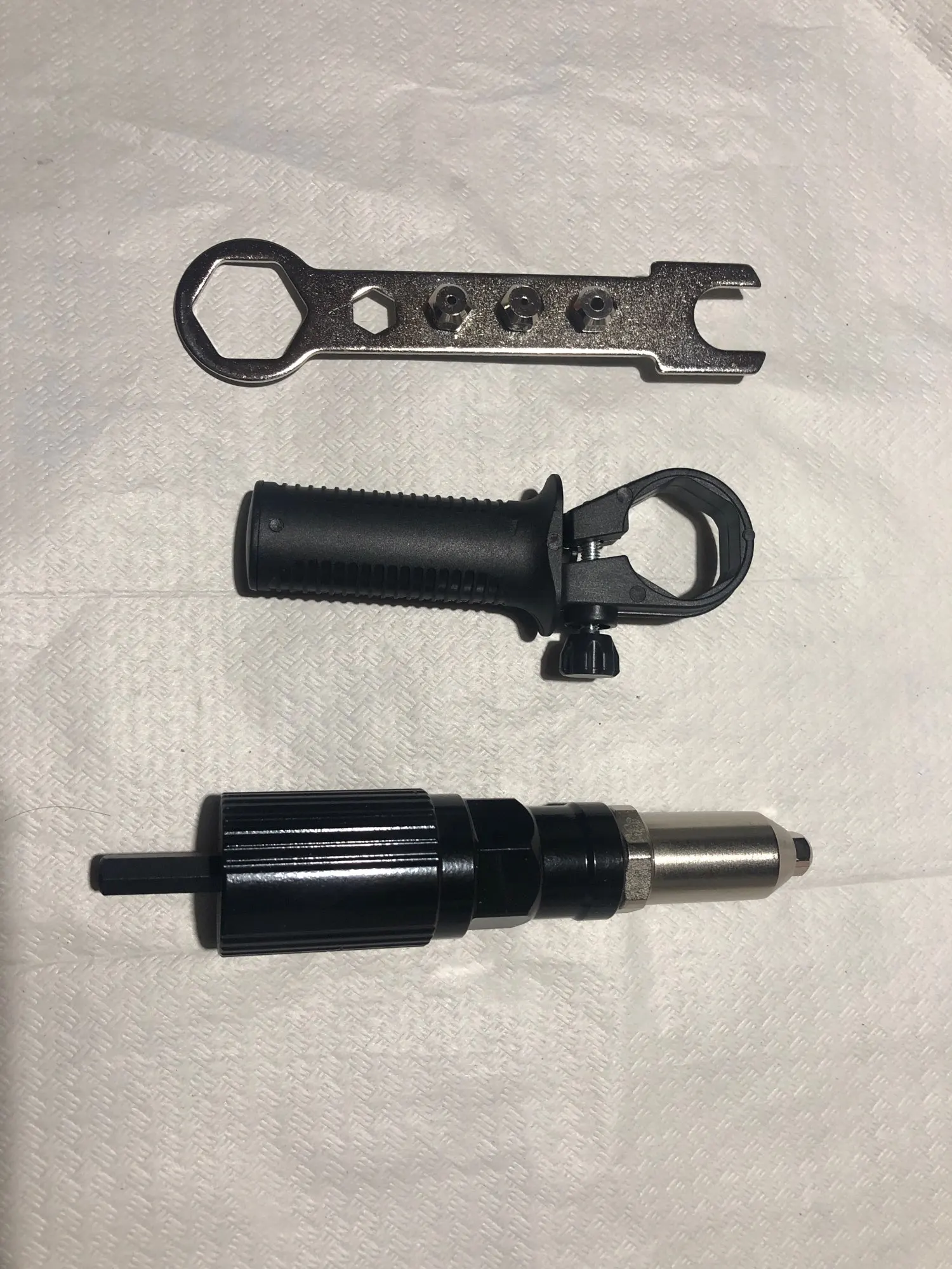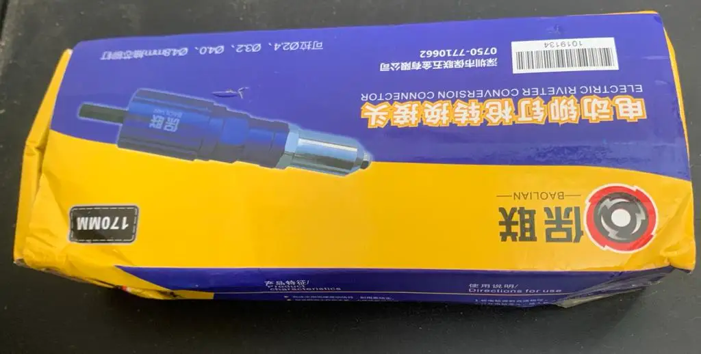 Характеристики:Основной материал: алюминиевый сплавЦвет: синий и черныйИсточник питания: работает с электрической дрельюМакс. Об/мин: 1000 об/минМинимальная сила крутящего момента: 15 Н. МРазмер упаковки: 190*140*30 мм/7,5*5,5 * 1.2inВес упаковки: 460 г/1.0lbИнструкции по использованиюОтрегулируйте электрическую дрель на подходящую шестерню.Откройте патрон электрической дрели, вставьте коннектор адаптера и пропустите хомут.Включите функцию разворота электрической дрели и положите в заклепки гвозди соответствующей спецификации, пока не услышите звук «Da».Включите функцию прямого вращения снова, чтобы цель пробивных отверстий и управлять заклепками.Включите обратную функцию снова и выйдите из заклепки.Упаковочный лист:1 * клепальный адаптер1 * вспомогательная ручка4 * клепальная головка1 *Гаечный ключ