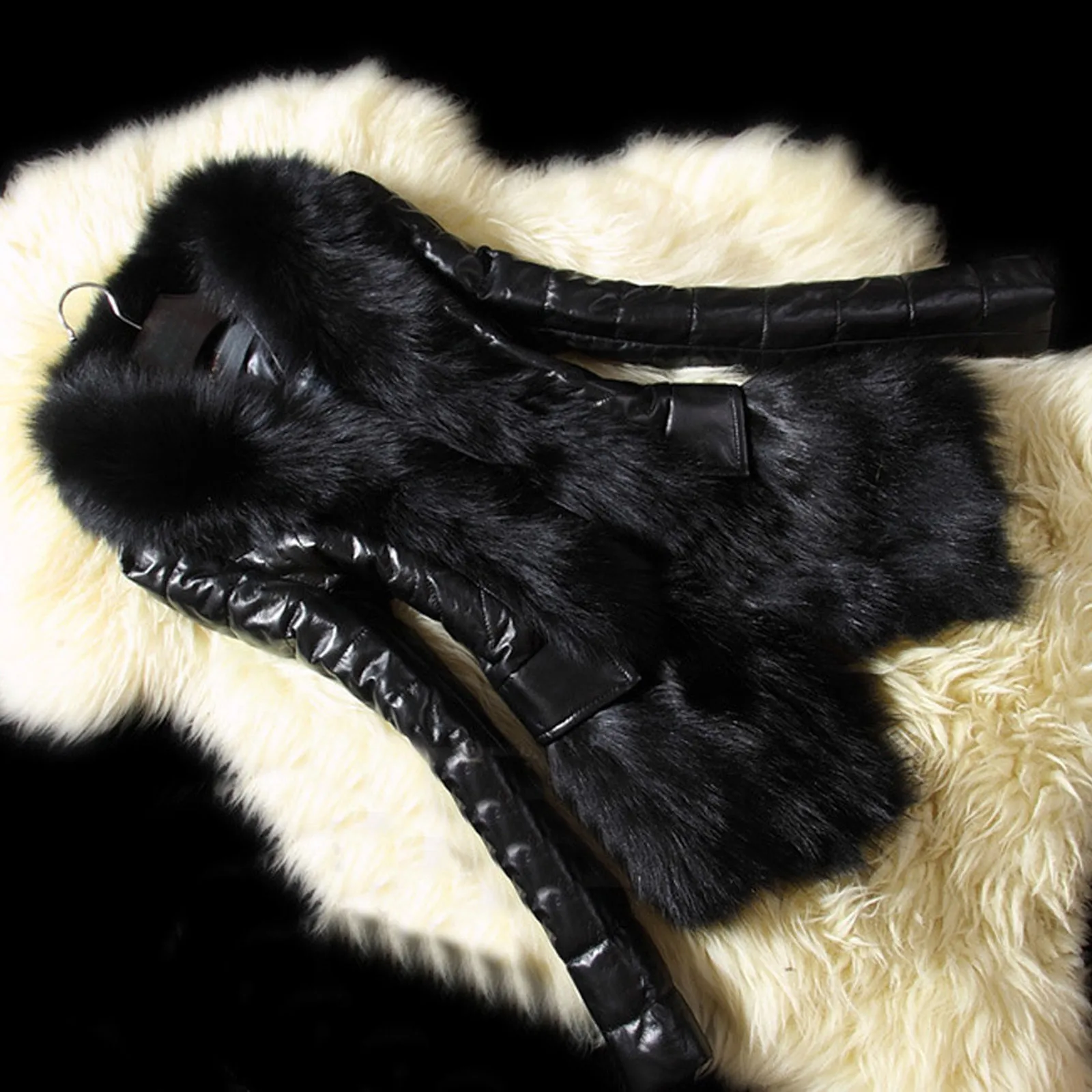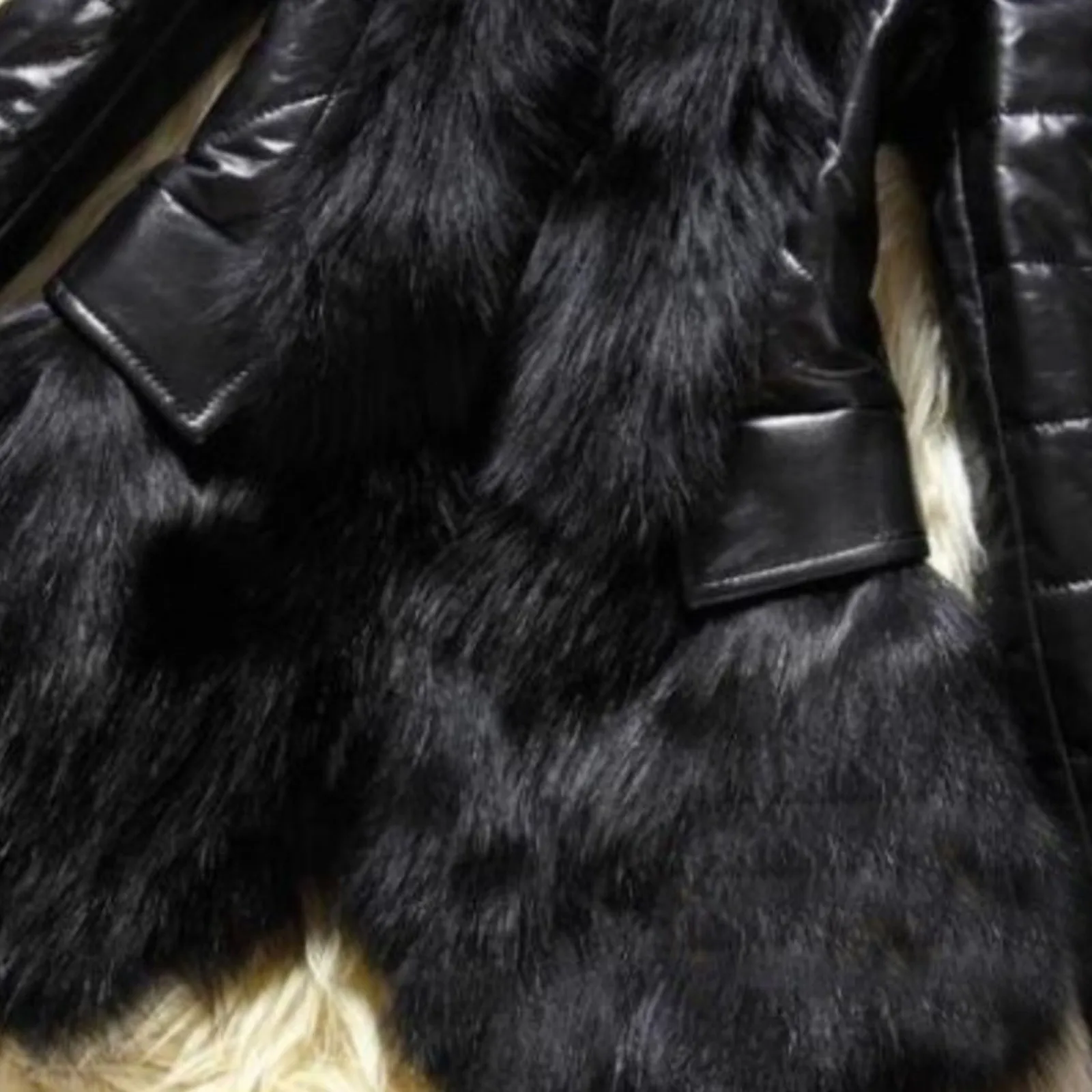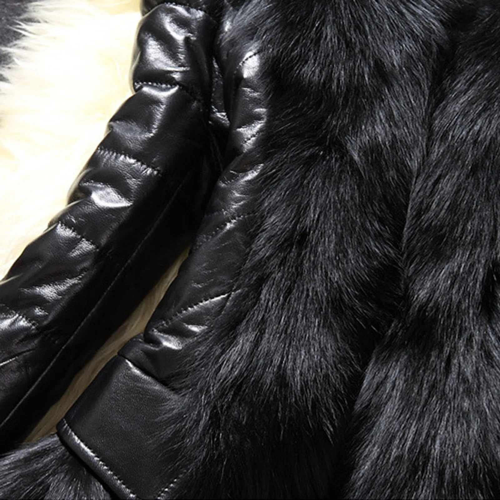 Женское теплое кожаное пальто с длинным рукавом и меховым воротником
