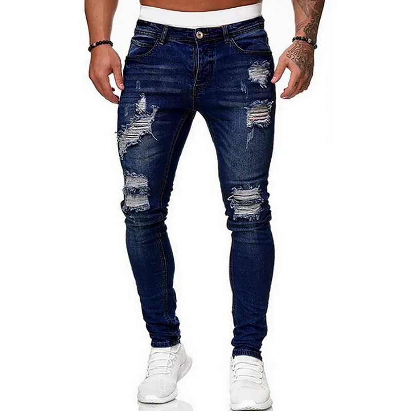Мужские рваные узкие джинсы, синие облегающие брюки-карандаш с дырками, байкерские повседневные брюки, уличная одежда 2022, джинсовая мужская одежда высокого качества