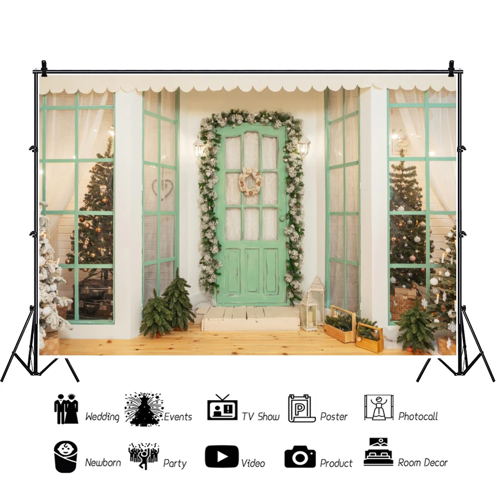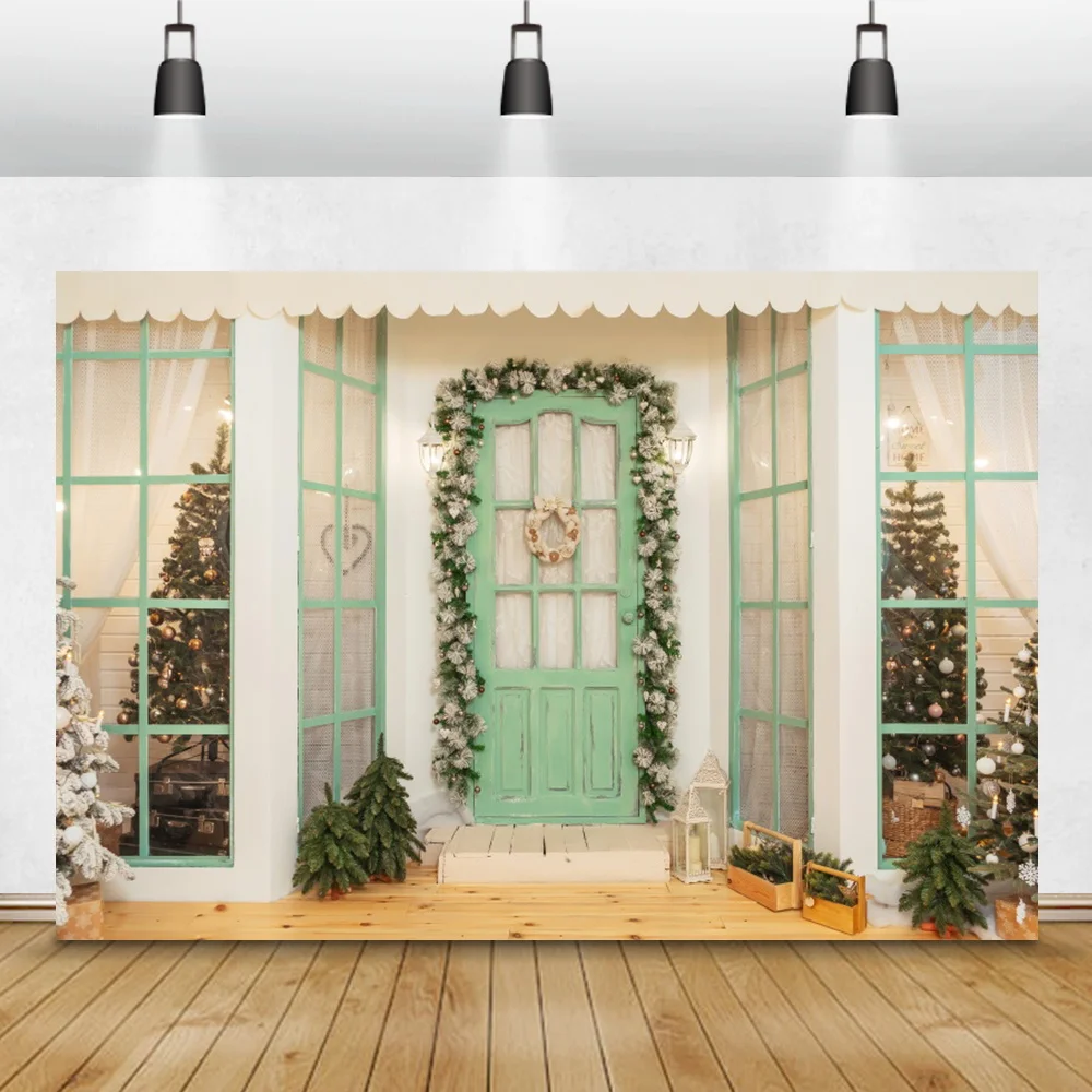 Фон для детской фотосъемки с изображением рождественской елки французского окна двери дуги деревянного пола