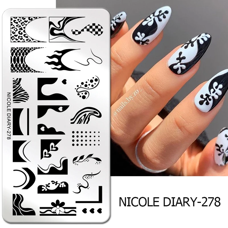 Трафареты NICOLE DIARY для стемпинга ногтей, пластины для французского маникюра с волнистыми цветами, черные и белые