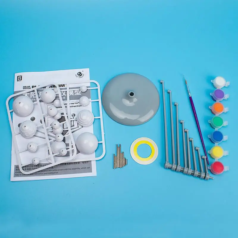 Содержит 3d-солнечную систему модель «планетарий», кисть, полосу красящих горшков, стенд с вращающимися дужками, стальными полосками, песочной бумагой, шаблон Кольца Сатурна и подробные инструкции.