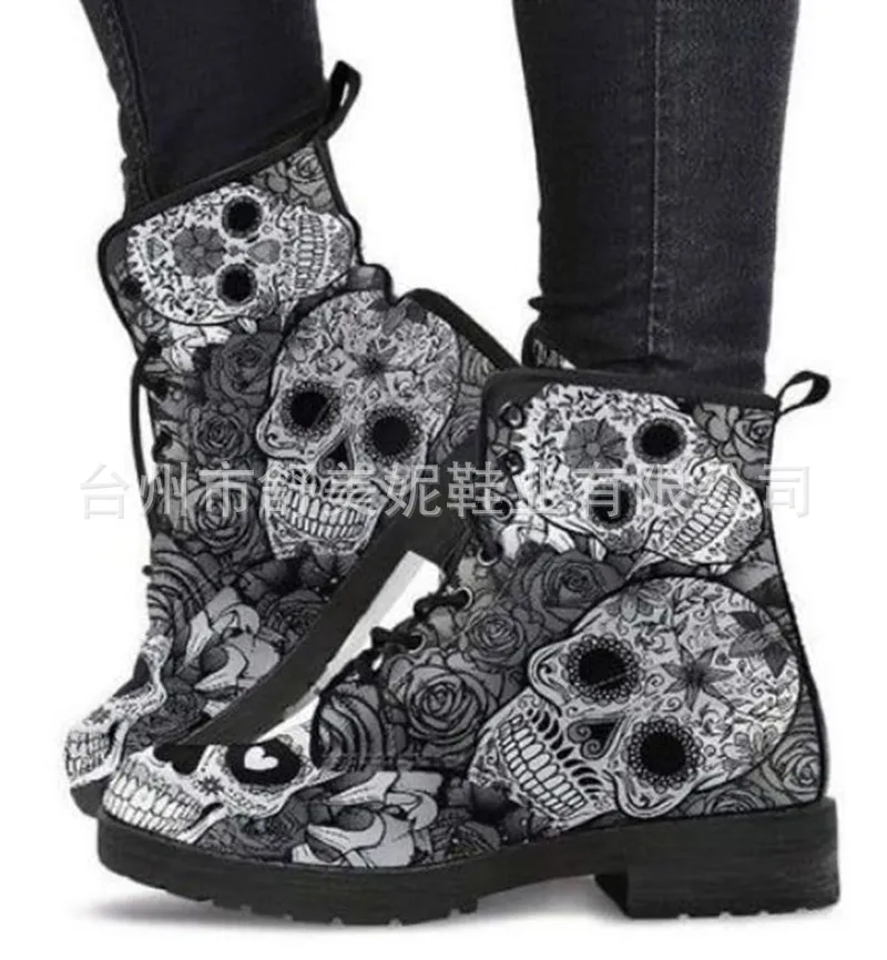 Женские ботильоны со скелетом для снежной погоды, мотоциклетные ботинки с черепом на низком каблуке, винтажные теплые зимние ботинки из искусственной кожи, увеличивают рост 43, 2021