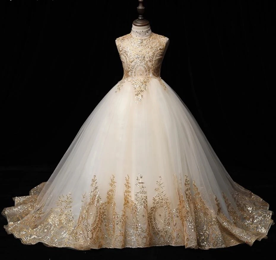 Длинное платье-пачка для девочек с цветами, кружевные платья с золотыми блестками для выпускного вечера, вечерние платья для девочек, свадебные платья принцессы