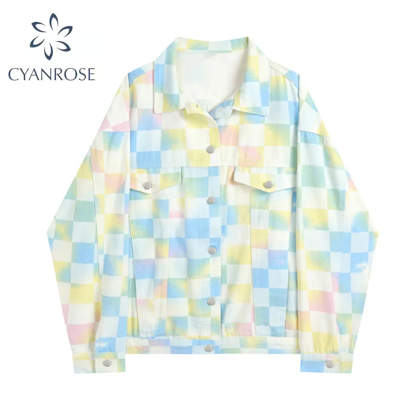 Женская джинсовая куртка на весну и осень, новинка, уличная одежда, Модный женский однобортный Повседневный Свободный Топ в клетку с длинным рукавом и завязками