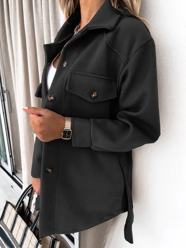 Женская шерстяная однобортная куртка, Повседневная однотонная Свобо...