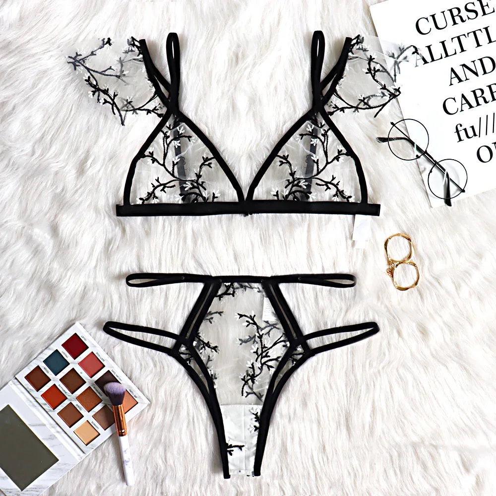 Комплект женского нижнего белья, прозрачный, кружевной, с вышивкой