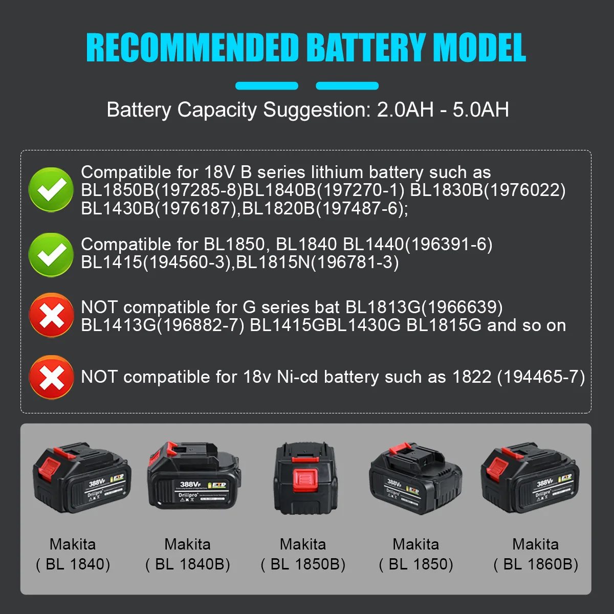 √ Совместим с литиевой батареей серии 18 в B, такими как BL1850B(197285-8),BL1840B(197270-1),BL1830B(197602-2),BL1430B(197618-7),BL1820B(197487-6);√ Совместимость с BL1850,BL1840,BL1440(196391-6),BL1415(194560-3),BL1815N(196781-3);× Не подходит для аккумуляторов серии G, таких как BL1813G(196663-9) BL1413G(196882-7) BL1415G BL1430G BL1815G и так далее× Не совместимы для 18v Ni-CD батареи, такие как 1822(194465-7)
