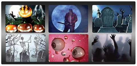 Вспомните сцены из любимых фильмов ужасов.Этот выбор в комплекте с классикой, такой какБензопила сумасшедшего, спасающихся зомби, жуткие Глазные яблоки, Джек-о-фонарь, жуткое кладбище и танцующих скелетов.