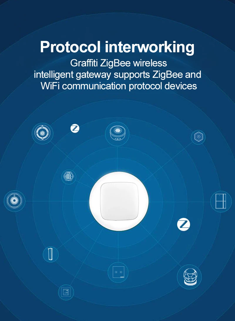 Беспроводной смарт-шлюз Tuya Zigbee поддерживает два устройства протокола связи Zigbee и WiFi. Один Шлюз может реализовать соединение следующих различных протоколов устройств, что облегчает вам построение умного дома.