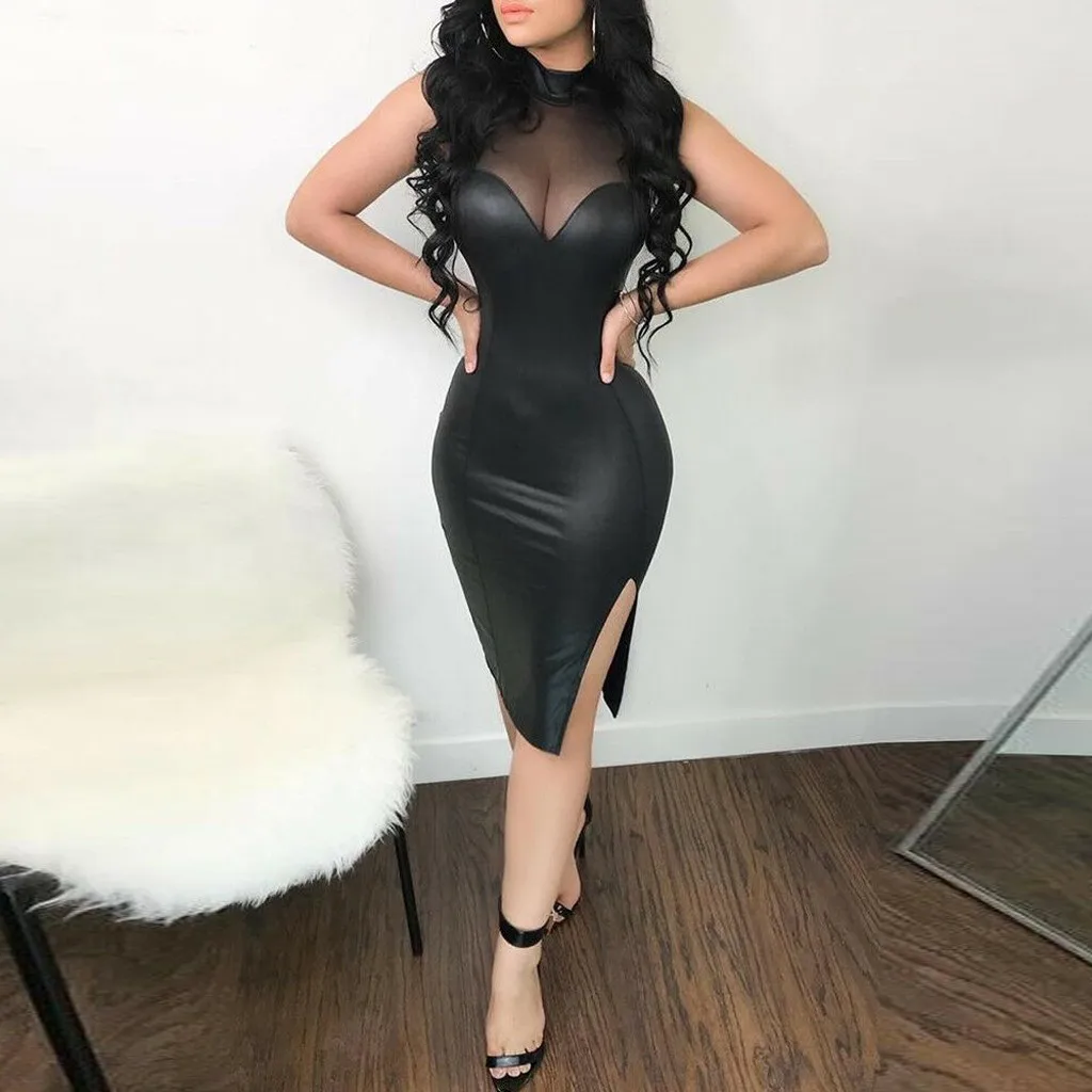 Модное женское тонкое сексуальное сшитое платье без рукавов из кожи
