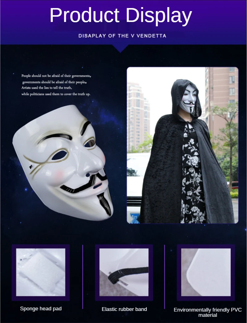 Одноразовые страшные маскарадные маски для Хэллоуина в стиле стимпанк, вечерние маскарадные маски для Хэллоуина, многоразовые реквизиты для Хэллоуина Спецификация: Название: v-образная пластиковая маска Vendetta Материал: пластик Размер: около 19*17 см Использование: танцевальные вечеринки, бары, вечеринки, карнавал, выступления и т. Д. Характеристика: 1. Экологически чистый и удобный Светильник тонкий, хорошая прочность, не легко повредить. 2. Трехмерная Толстая Толстая v-образная маска из ПВХ для защиты окружающей среды является более стабильной, более качественной и более реалистичной. Советы: 1. Выньте кусок бумажного полотенца; 2. После складывания пополам поместите его на подушку маски; 3. После размещения соответствующего количества бумажных полотенец Используйте скотч, чтобы наклеить его на маску; 4. В комплекте, не влияя на эффект ношения. Примечание: При ношении, если вы чувствуете, что маска поставляется с губкой, которая не достаточно толстая, и вы ударите глаза, используйте вышеуказанный метод для уплотнения подушки головы, чтобы сделать ее более удобной в носке! Посылка: 1 * маска