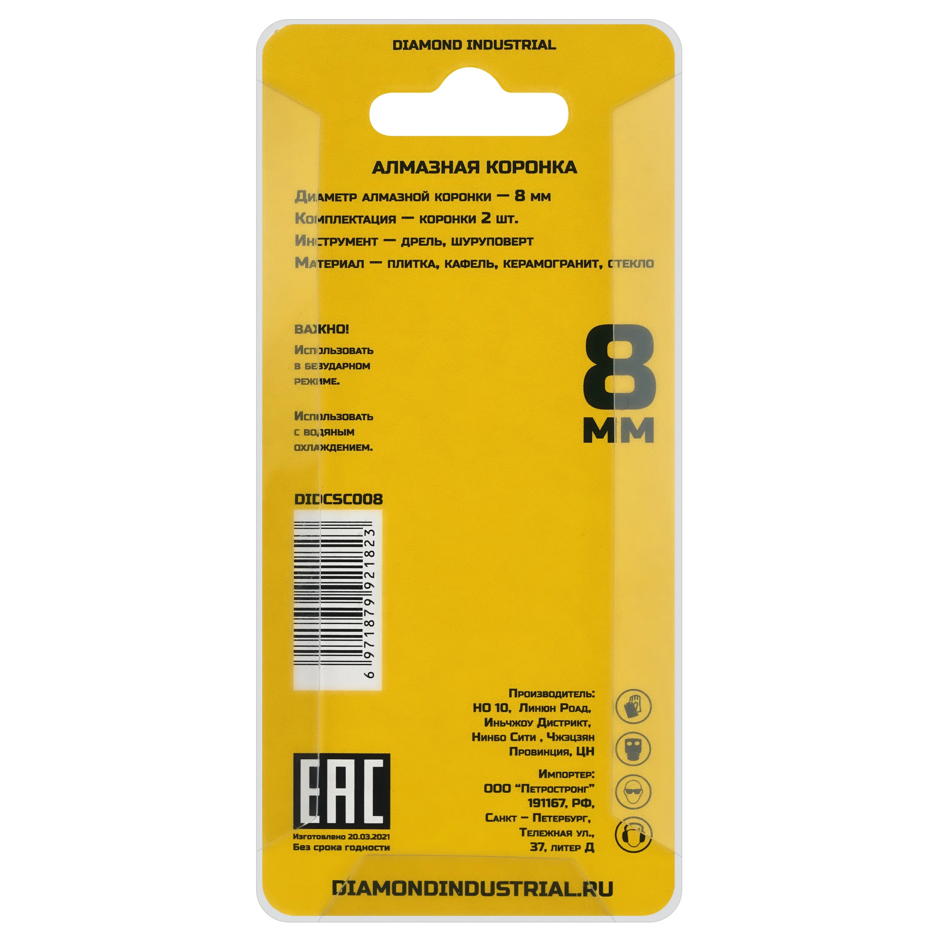 Алмазная коронка по керамограниту, плитке, кафелю 8 мм Diamond Industrial