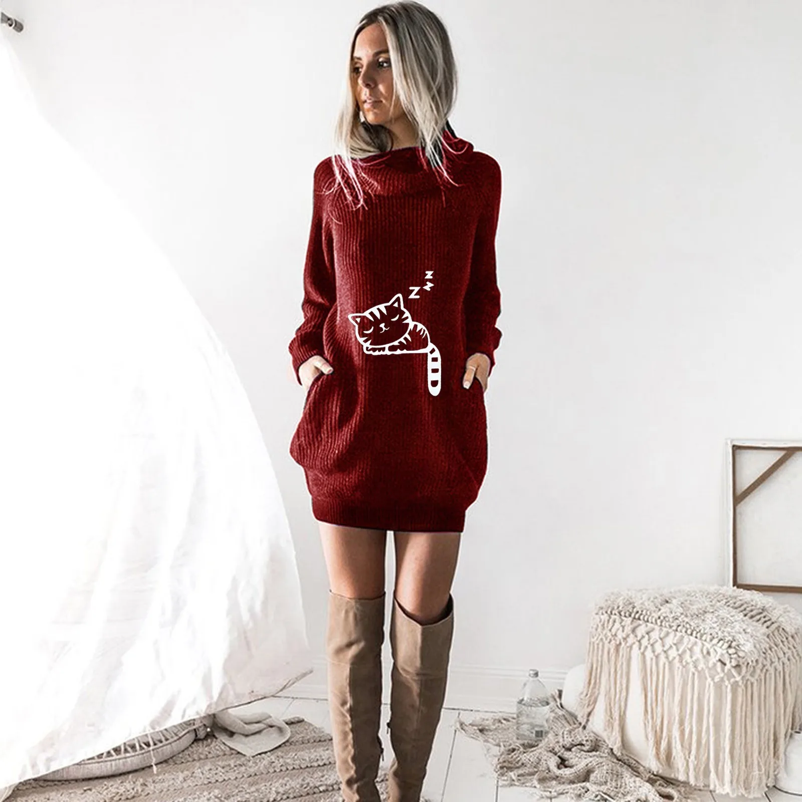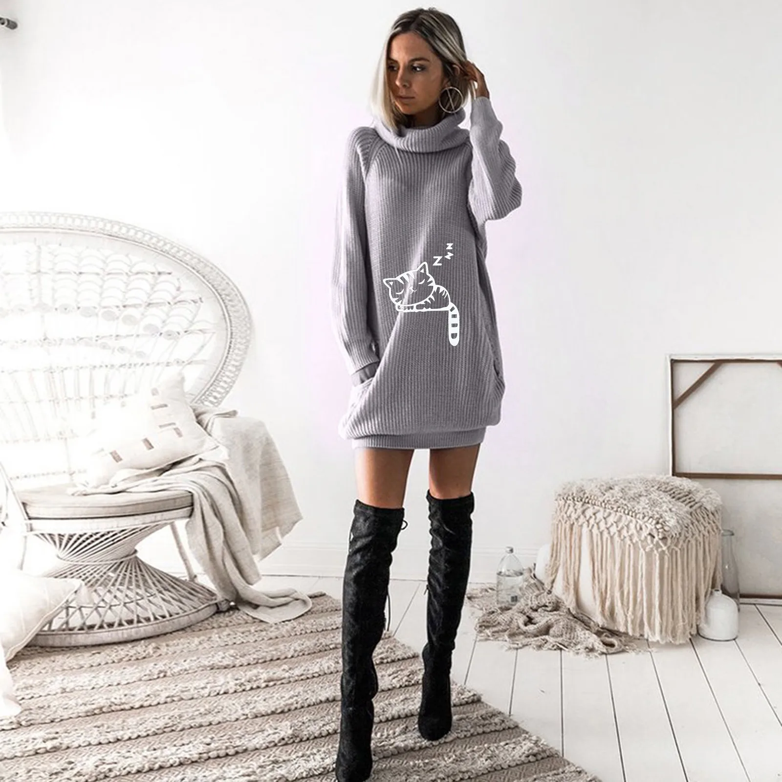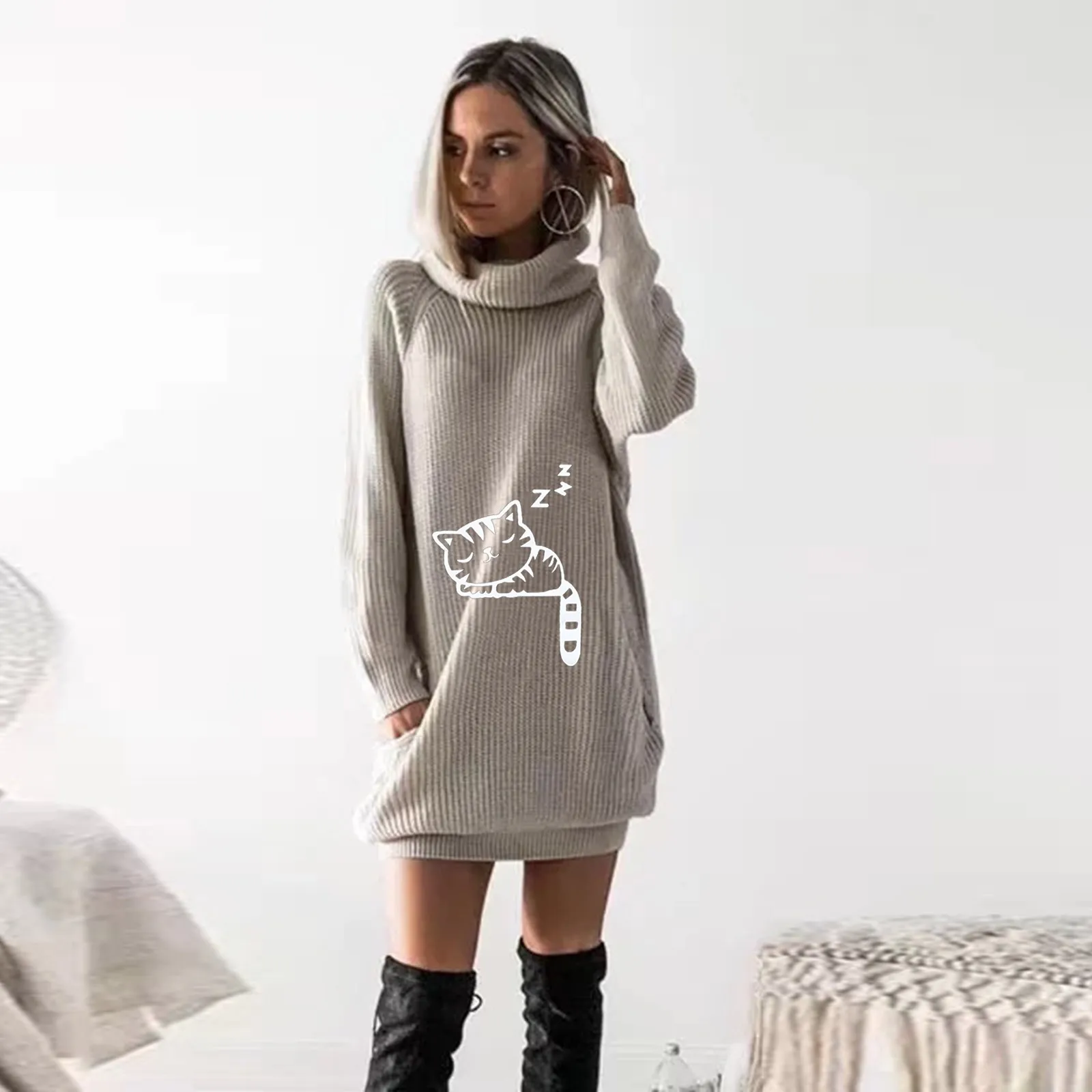 Женское трикотажное платье-свитер с высоким воротником и длинным рукавом