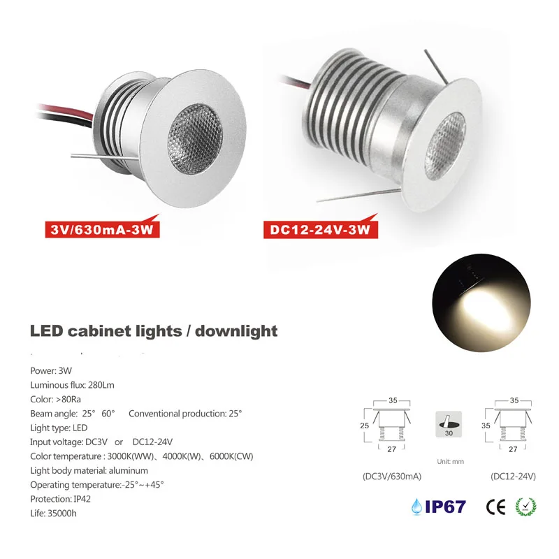 3 Вт 4 Вт светодиодный мини-прожектор 30 мм вырез утопленный светильник DC12V 24 в домашний кухонный шкаф потолочный светильник 25D/30D/60D угол луча