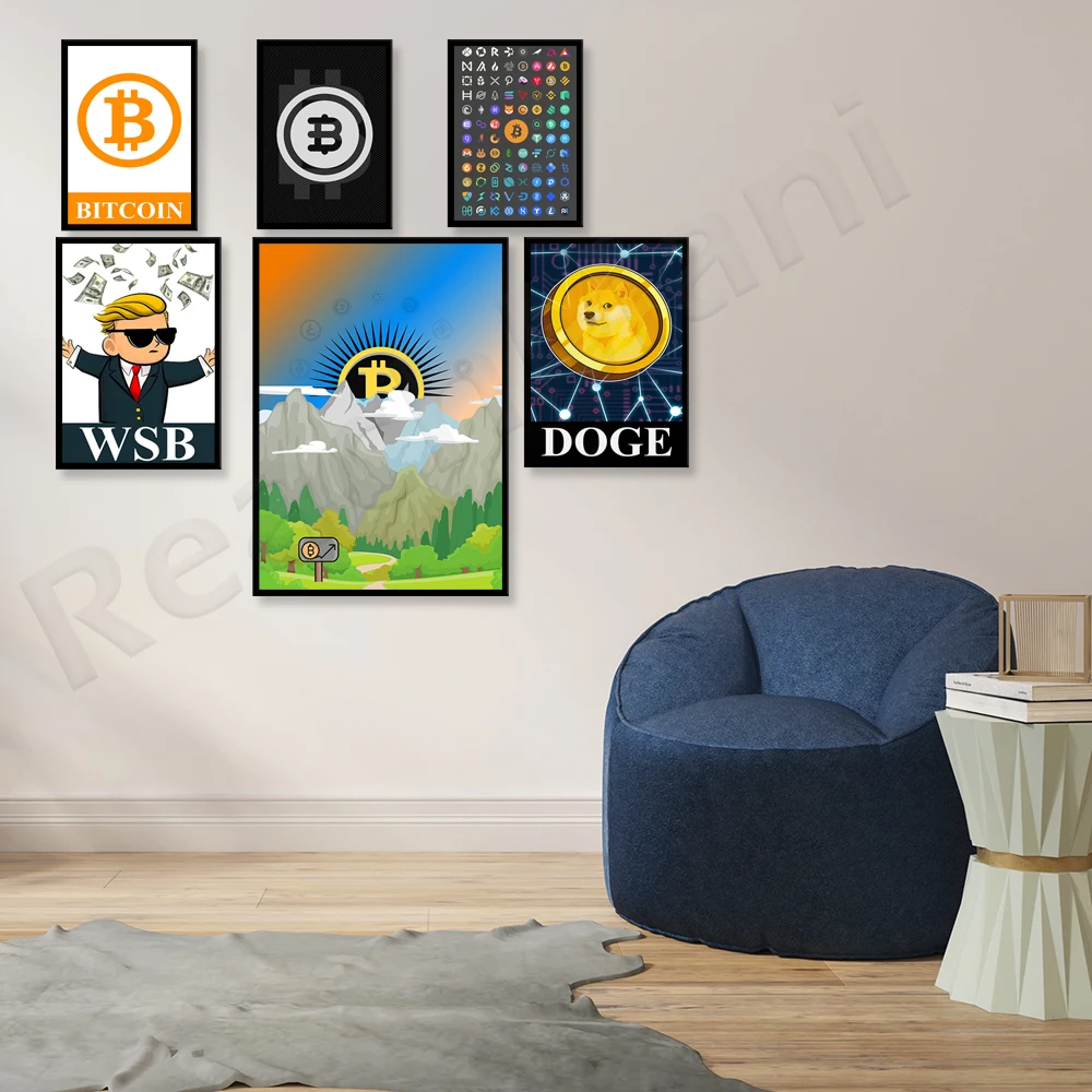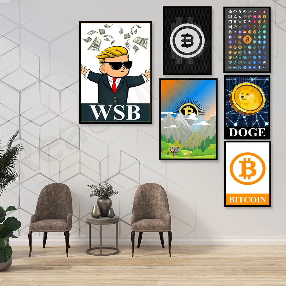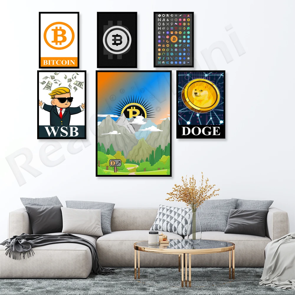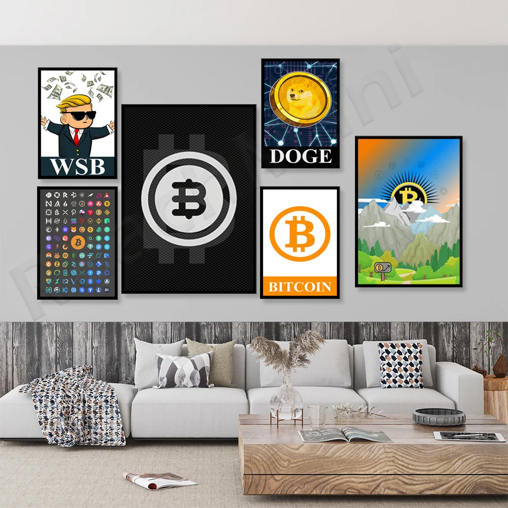 Настенное искусство биткоина, плакат знака криптовалюты, Биткоин, эфириум, ряби, лайткойн