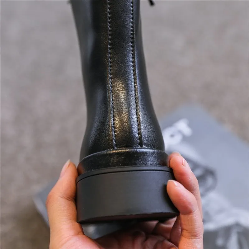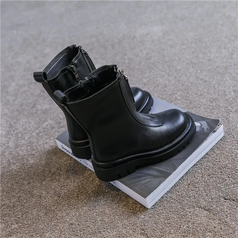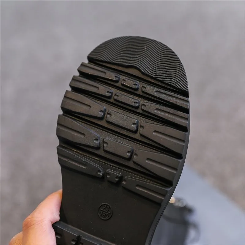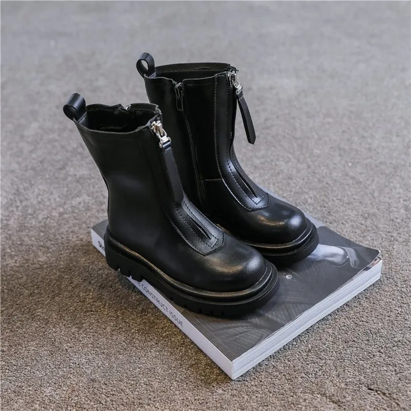 Детские длинные ботинки, модные дизайнерские черные ботинки из искусственной кожи для мальчиков и девочек, осенние ботинки на молнии спереди, шикарная детская зимняя обувь на плоской подошве