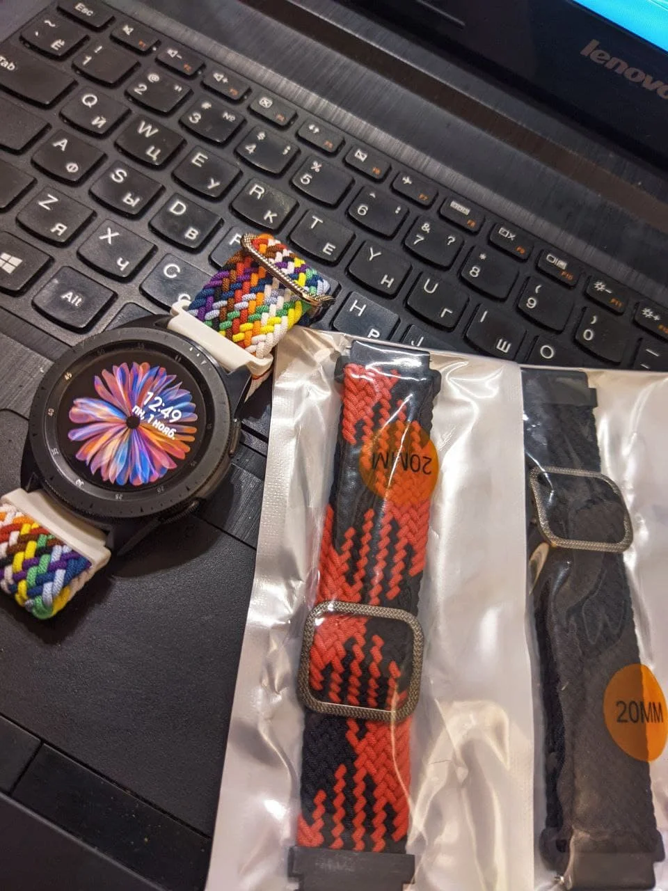 Ткань эластичная, поэтому зря брал регулируемый. "Пряжка" видно, что слезет быстро. Также вопрос к конструкции креплений: штивы не зафиксированы в месте соединееия браслета, поэтому если часто менять ремешки, то есть вероятность потери. Один запасной в комплекте лежит. Ну а дальше уже заказывать только новый браслет)