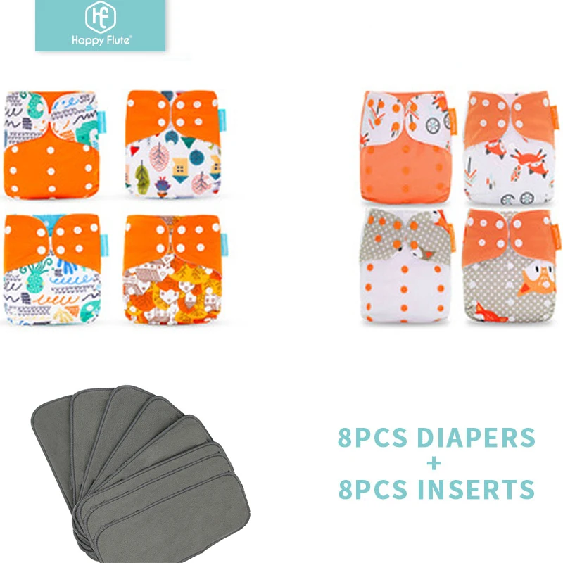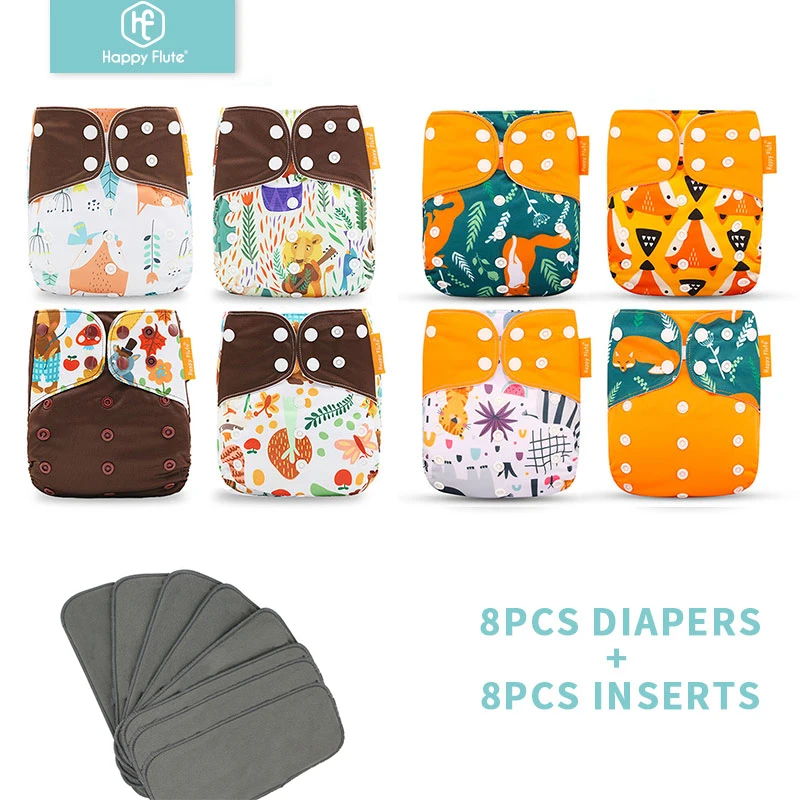 HappyFlute 8 подгузников + 8 вкладышей, детские тканевые подгузники, один размер, Регулируемые моющиеся многоразовые подгузники для маленьких девочек и мальчиков