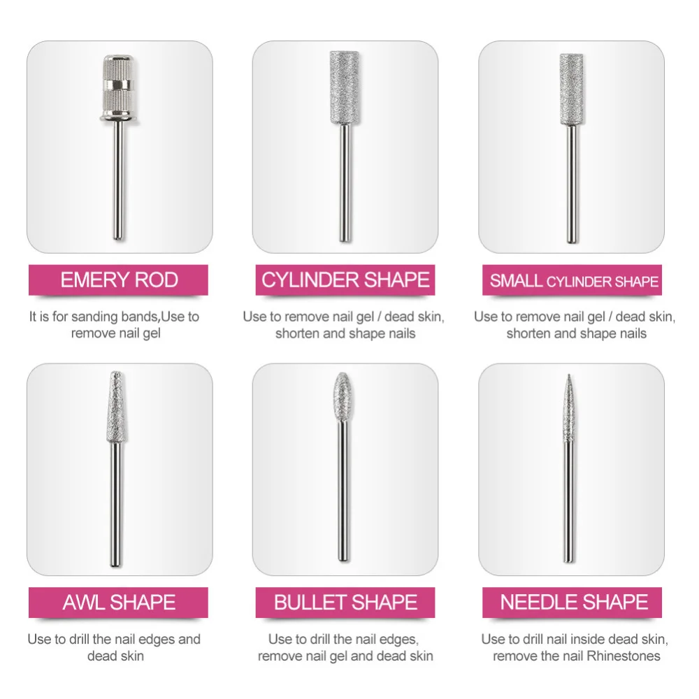 Электрическая машина для полировки ногтей маникюрный педикюр набор с 6 сверлами (5 алмазных бит, 1 наждачный стержень с 6 шлифовальными лентами) Какая функция для бит?
