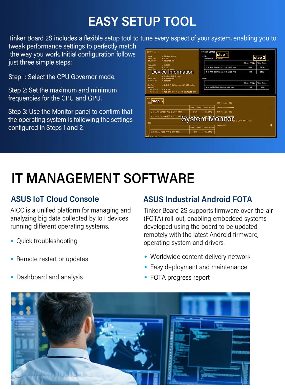 Pro-grade admin: облачная консоль ASUS IoT для управления данными и анализа, а также поддержка прошивки по воздуху (FOTA).