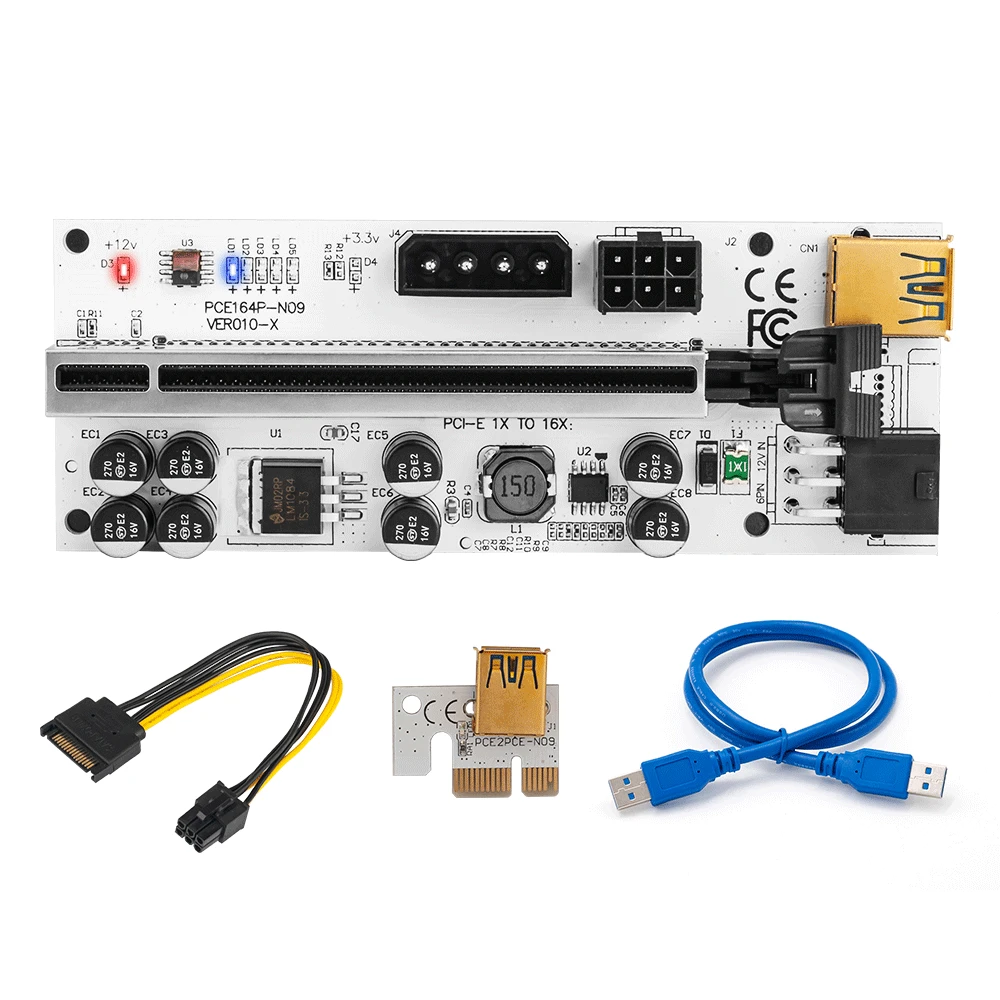 1 * PCI-E 16X подъемная плата,1 * Адаптер PCI-E 1X,1*60 см USB 3,0 кабель,1 * SATA 15 Pin на 6 Pin кабель питания