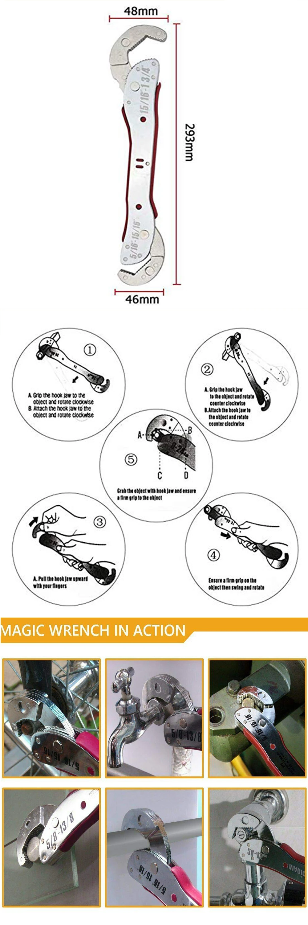 Универсальный Регулируемый ключ, набор гаечных ключей, ручка 6-32 мм, регулируемая быстрая оснастка, многофункциональнаяОсобенности:Набор гаечных ключей для оснастки трубы, инструмент высокой твердости, хорошей прочности, крутящего момента, механического тонкого шлифования зубов, укуса сильный, прочный и прочный, высокая твердость крутящего момента.Гаечные ключи подходят для соединения труб, винтов и гаек, быстрого демонтажа, зажима не скользит.Общая термическая обработка, обработка поверхности, красивая одежда.Технология самостоятельной регулировки, которая позволяет автоматически адаптироваться к размеру.Спецификация:Материал: CR-V60 сталь + резина + пластикБольшой гаечный ключ: Размер 23 ~ 32 мм (0,9 ''~ 1,25''), полная длина 27 см (10,6 ")Маленький ключ, дюймовый стандарт: Размеры 9-22 мм (0,35 "~ 0,9"), полная длина 21 см (8,3 "), две головы дизайнЦвет: красный + черный + серебристый (на фото)Вес: 700 г