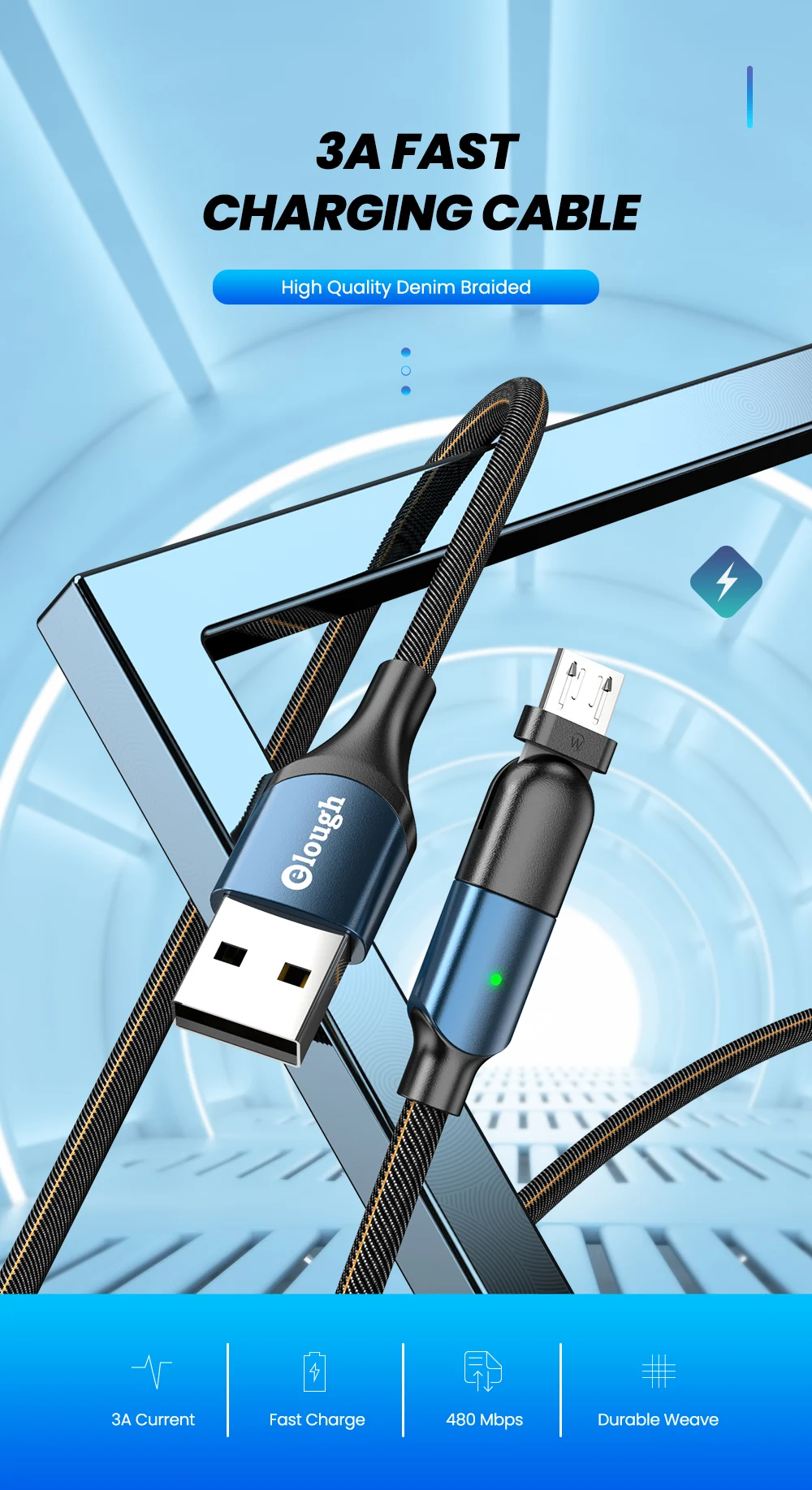 Зарядный кабель Micro USB Elough, поворотный на 180 градусов, 3 А