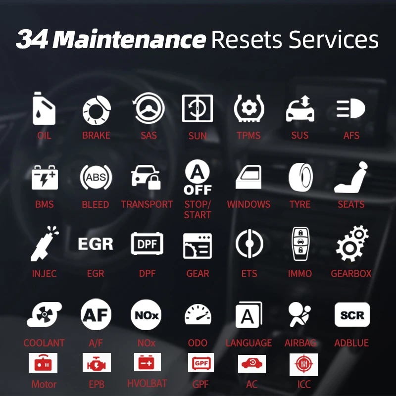 1. Обслуживание сброса масляной лампыПозволяет выполнить сброс для нового расчета системы жизнедеятельности моторного масла после изменения масла.2. Сброс электронного стояночного тормоза EPBЭто важно для поддержания безопасности и эффективности электронной тормозной системы.3. Батарея летучей мышиПозволяет сканировать устройство, чтобы оценить состояние заряда батареи, контролировать ток замыкания, зарегистрировать замену батареи и активировать остальное состояние транспортного средства.4. Сброс дизельных Сажевых фильтров DPFСпециально работает для дизельных Сажевых фильтрующих систем с регенерацией DPF, замена компонентов DPF после замены блока управления двигателем.5. Сброс датчика рулевого управления SASПомогает очистить воспоминания датчика угла поворота руля и играет важную роль в калибровке датчика угла руля.6. Сброс системы контроля давления в шинах TPMSИмеет смысл в отображении сенсорных идентификаторов из Эбу транспортного средства, вставке TPMS сенсорных сменных идентификаторов и датчиков тестирования.7. Программирование ключа IMMOУникальная функция программирования автомобильных ключей и считывания ПИН-кода, она в основном используется для отключения ключей от утерянного транспортного средства и программирования нового сменного ключа fob.8. Кровотечение из АБС-пластикаABS тормозное кровотечение, чтобы получить твердую тормозную колодку После истощения воздуха после ремонта ABS насосной системы.9. Сброс крыш солнцаSunroof должен быть сброшен, когда блок управления sunroof имеет коммуникационную проблему или изменен.10. Сброс подвескиПопробуйте сбросить электронное пневматическое колесо Подвески с системой массажа закройте все двери koeo flip через систему сообщений перейти к сбросу подвески или выключению.11. Сброс коробки передач (коробки передач)Процедура сброса передачи Адаптивное обучение DIY. Запуск автомобиля и вождение. Как только вы выполните эту процедуру, блок управления двигателем (ECU) и блок управления передачей (TCU) будут работать вместе, чтобы узнать, как Вы управляете, отслеживая ваш шаблон вождения. После того, как вы выполните этот метод программирования TCU / ECU, Управляйте автомобилем.12.AFS сброс фары«AFS» означает адаптивную систему переднего освещения (в ночное время с би-ксеноновыми фарами), она поворачивается с обеих сторон, Нажатие этой кнопки означает, что они остаются направленными вперед и не поворачиваются, когда вы поворачиваете руль.13. Кодирование инжектораУтечки инжекторов и некоторые мертвые инжекторы могут быть пропущены даже когда инжектор отключен. Другие проблемы с системой зажигания и механическими компонентами также могут не показывать потерю оборотов в минуту при выключении инжектора.14. Адаптация дроссельной заслонкиКорпус дроссельной заслонки представляет собой трубу с поворотным плоским клапаном (бабочкой), которая используется для контроля количества воздуха, входящего в двигатель. В автомобиле с электронным топливом Датчик положения дроссельной заслонки и датчик воздушного потока связываются с компьютером, который поставляет соответствующее количество топлива, необходимое для инжекторов. Необходимо повторно изучить положение датчика дроссельной заслонки после очистки или ремонта.15. Передача обученияИнструмент сканирования контролирует определенные датчики поло