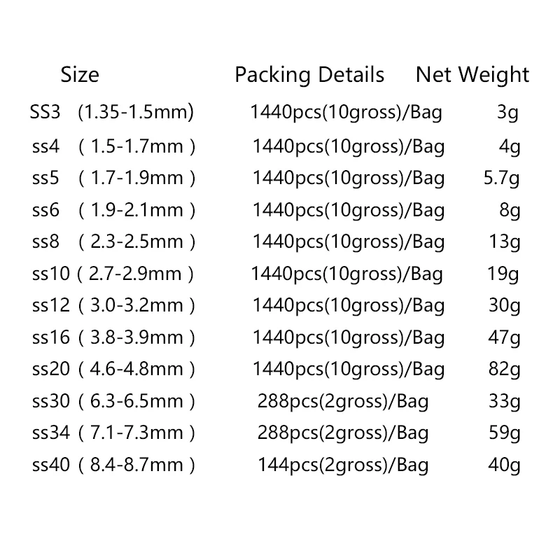 Размеры: SS10 SS16 SS20 SS30Упаковка: SS10-SS20 1440 шт SS30-SS34 288 шт SS40 144 штМатериал: стеклоТехника: Горячая фиксация утюгомНиз: клей Gley