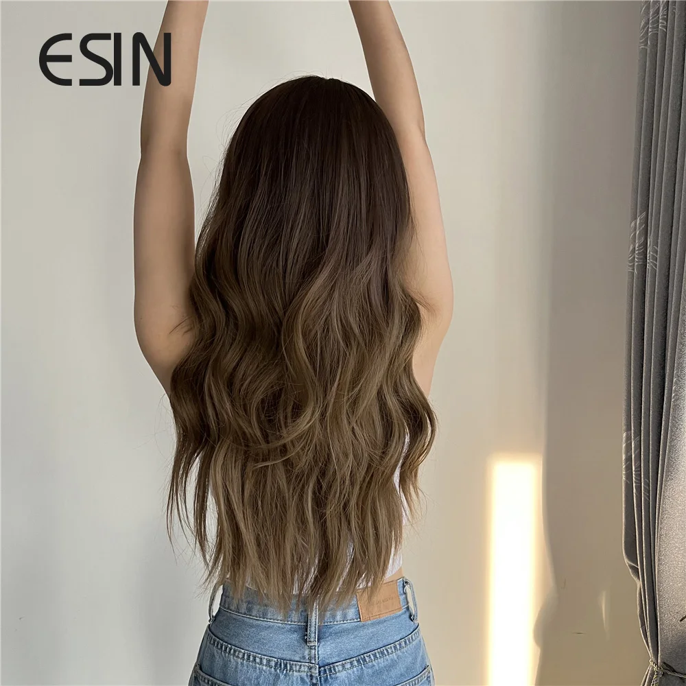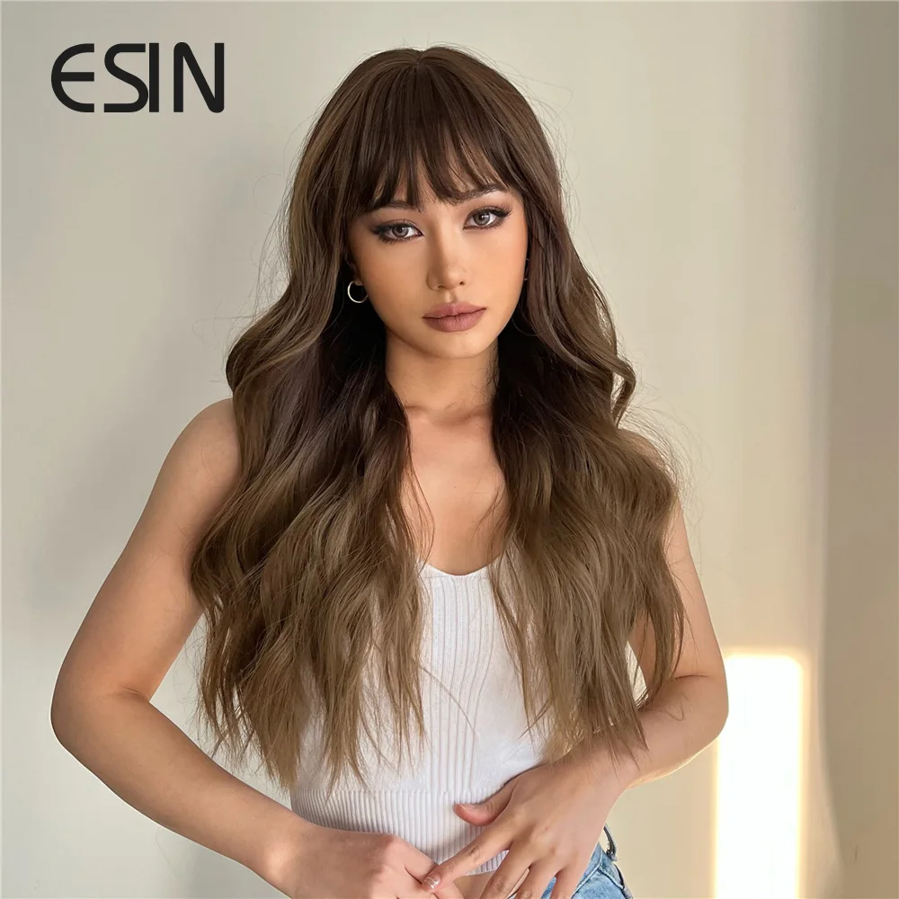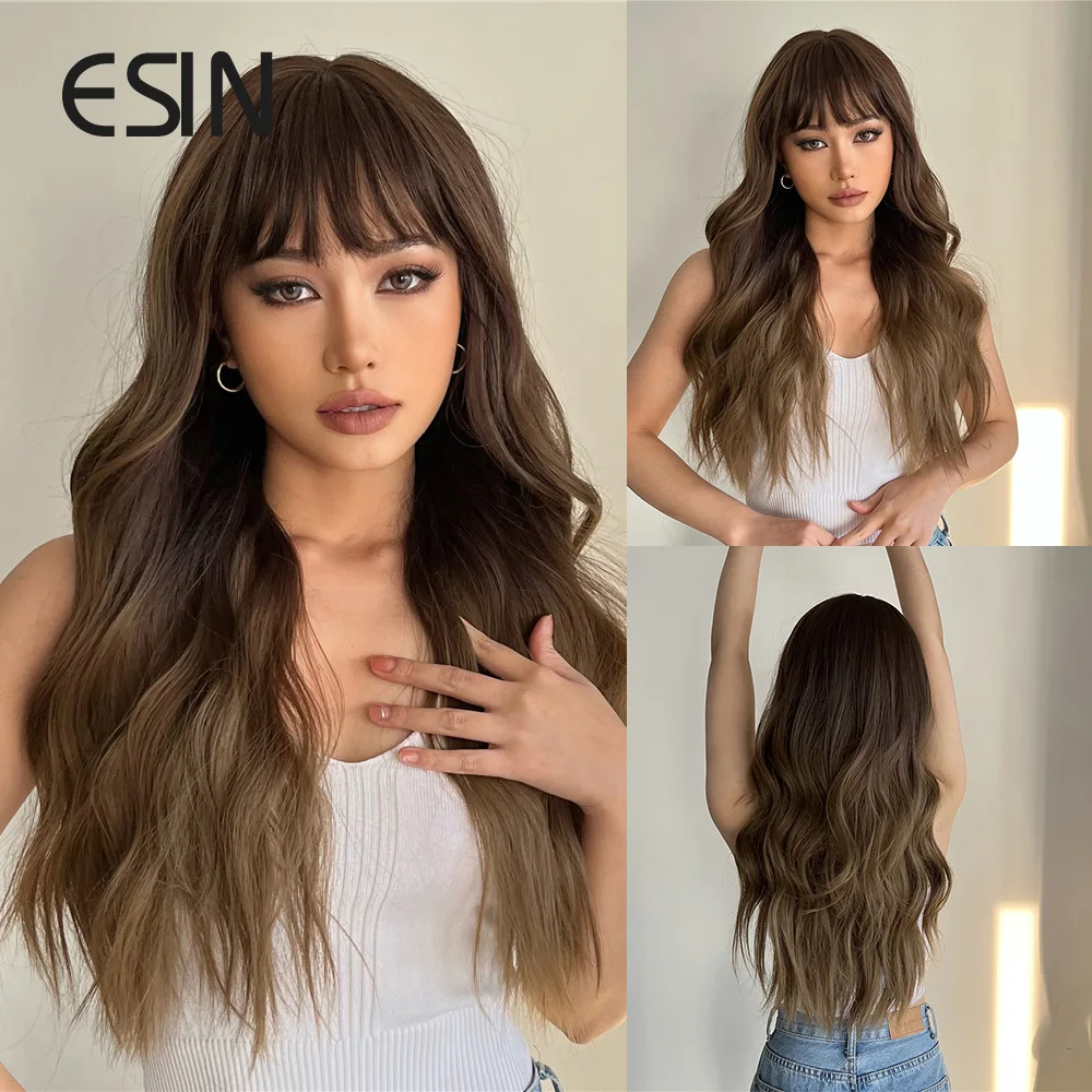ESIN синтетические волосы Омбре коричневые длинные волнистые парики с челкой для женщин натуральвечерние праздничные термостойкие