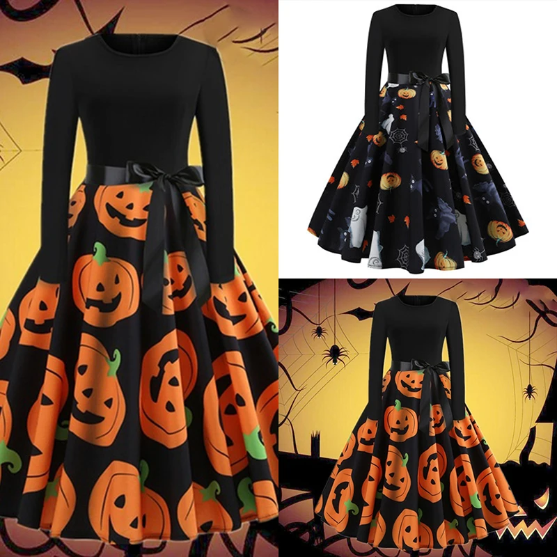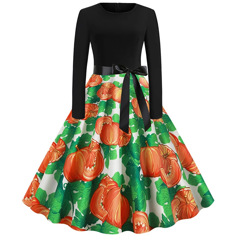 Нарядное рождественское женское платье с тыквой для Хэллоуина, платье принцессы с длинным рукавом, вечерние костюмы, винтажное платье 50s 60s