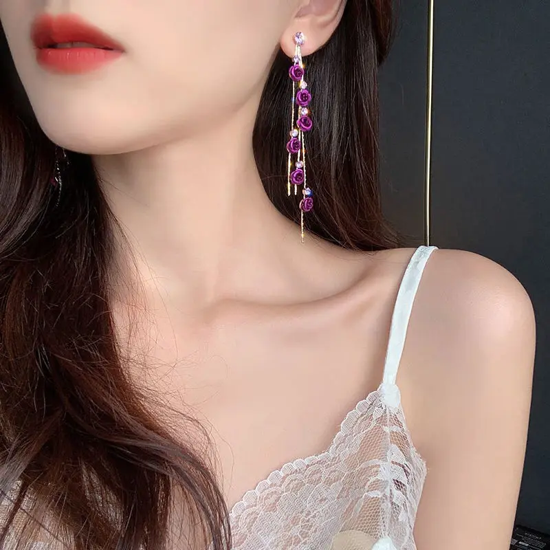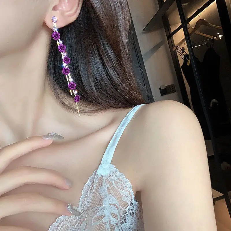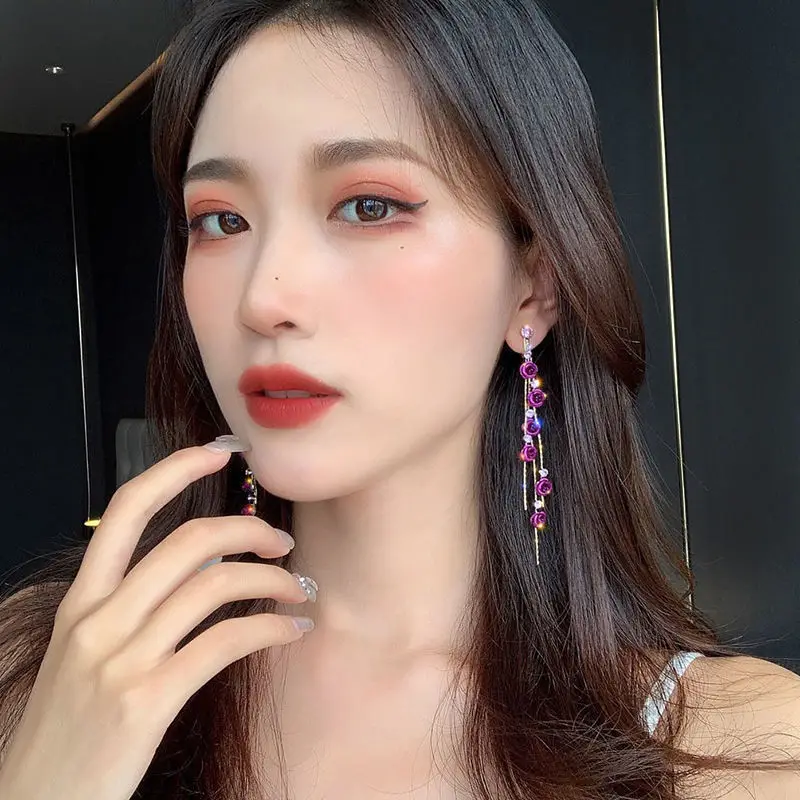 Корейские модные висячие серьги с лепестками роз для женщин синие белые длинные висячие серьги с кисточками ювелирные изделия для рождества свадьбы вечеринки 2021