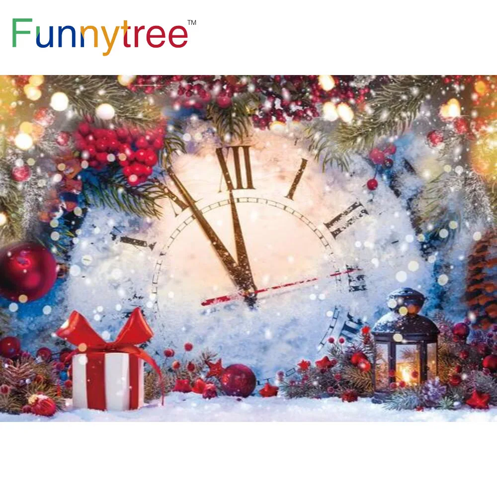 Фон Funnytree с новогодвечерние кой 2022 Рождество Зима часы снег горошек огни колокольчики баннер подарки ветки узел фон