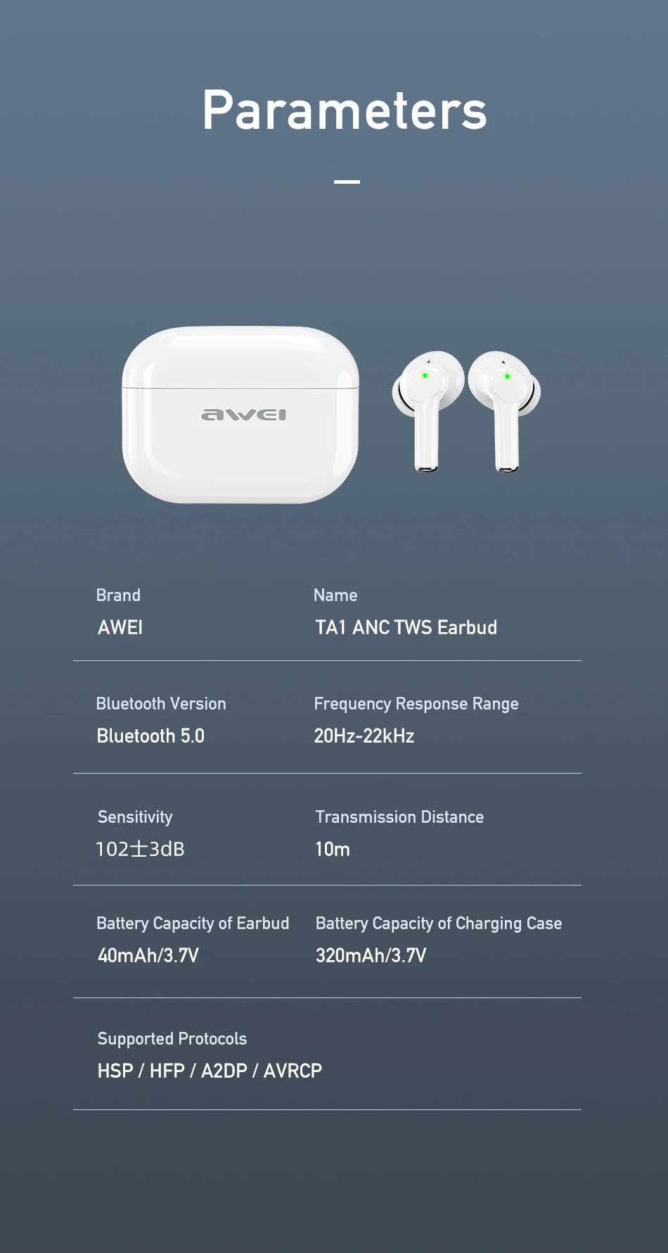 Особенности:> Настоящие беспроводные наушники: наушники TA1 in-Ear Bluetooth, активное шумоподавление, сенсорный датчик, зарядный чехол Type-C, водонепроницаемый IPX4, TWS наушники Bluetooth 5,0> ANC: Усовершенствованный встроенный Чипсет непрерывно контролирует экологический низкочастотный шум и заранее рассчитывает, чтобы отменить шум, прежде чем вы его услышите. (Эффективное снижение 25 дБ).> Сенсорное управление: с помощью сенсорного экрана вы можете управлять музыкой, громкостью, звонками, функцией ANC.> 4 ч Время воспроизведения: Наушники Awei Bluetooth обеспечивают 4 часа воспроизведения музыки, 3 часа вызова 200 часов в режиме ожидания.> Type-C: зарядное устройство и зарядный кабель все типа CТехнические характеристики:ANC активное шумоподавление.Кнопка включения/выключения: ДаРегулятор громкости: ДаСтиль: ушной крючокВерсия Bluetooth: 5,0Зарядный отсек: 320 мА · ч, беруши: 40 мА · ч★Время работы в режиме разговора: 3 ч.★Время воспроизведения музыки: 4 ч.★Время работы в режиме ожидания: 200 ч.Водонепроницаемость: Да; Водонепроницаемость IPX4