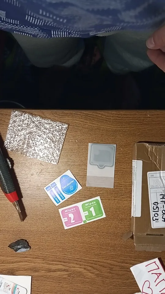 пнеопластовая коробочка, много салфеток, 2 маленькие кисточки. Переднее стекло без выреза под камеру, на вид немного уже экрана по ширине около 1-1.5 мм. Пока не ставил