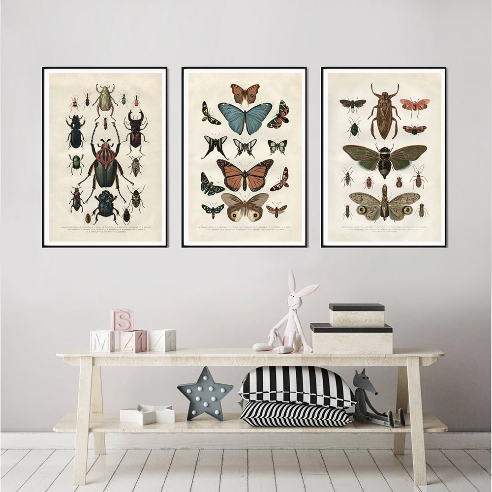 Винтажный постер в стиле ретро с насекомыми, животные, насекомые, бабочки, жуки, холст, живопись на холсте, картина маслом, украшение для дома