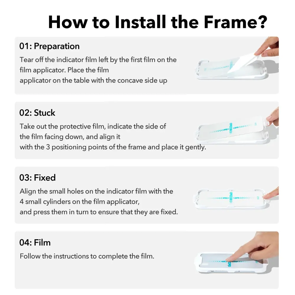 01: подготовкаОторвите индикаторную пленку от первой пленки на аппликаторе пленки. Поместите пленочный аппликатор на стол с вогнутой стороной вверх02: застреваетВыньте защитную пленку, укажите сторону пленки лицом вниз и выровняйте ее с 3 позиционируемыми точками рамы и аккуратно поместите ее.03: фиксированныйВыровняйте маленькие отверстия на индикаторной пленке с 4 маленькими цилиндрами на пленочном аппликаторе и нажмите их, чтобы убедиться, что они закреплены.04: пленкаСледуйте инструкциям для завершения фильма.