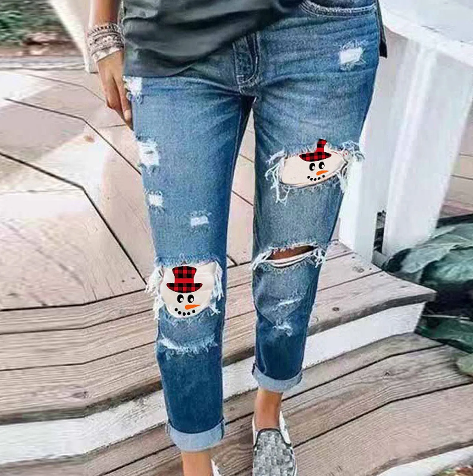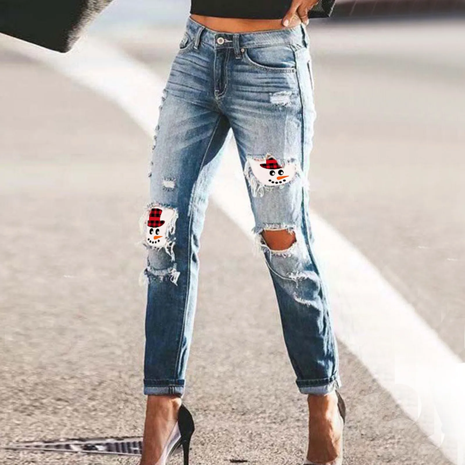 Женские джинсы со снеговиком, шапка, рваные джинсы, брюки, модные повседневные строгие черные брюки