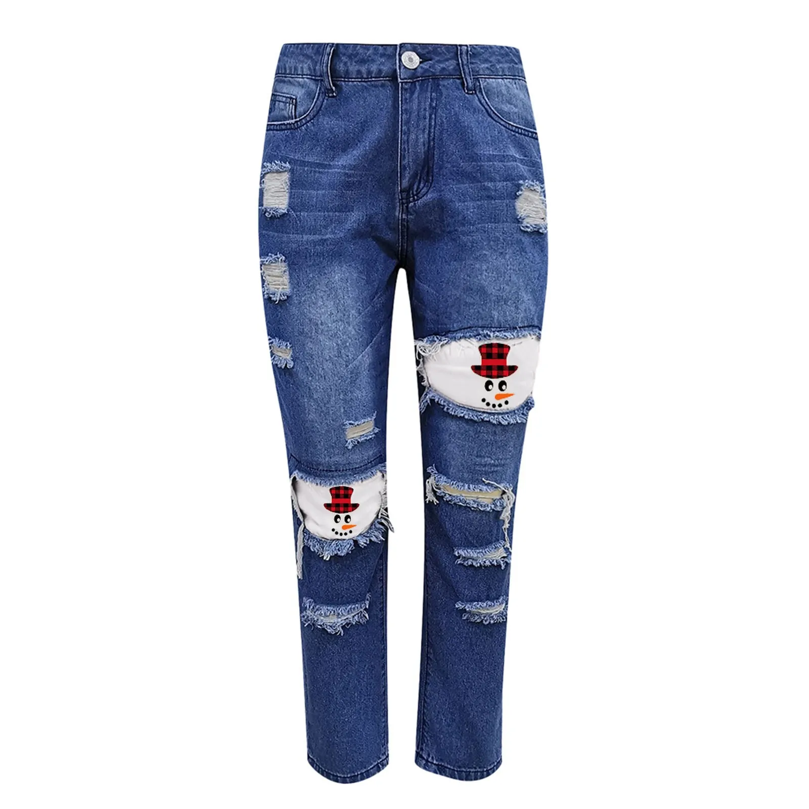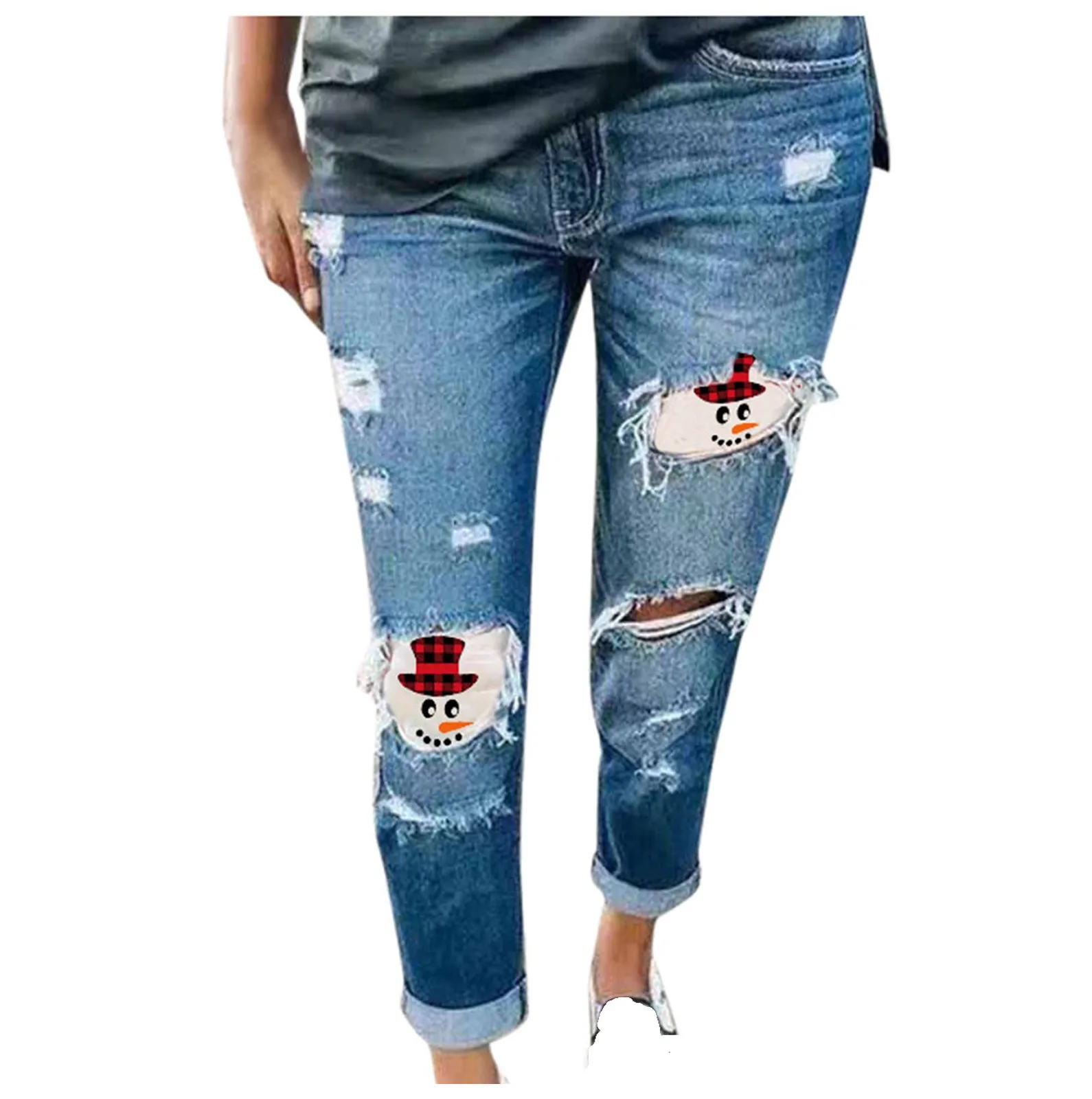 Женские джинсы с принтом снеговика, рваные джинсы размера плюс, брюки