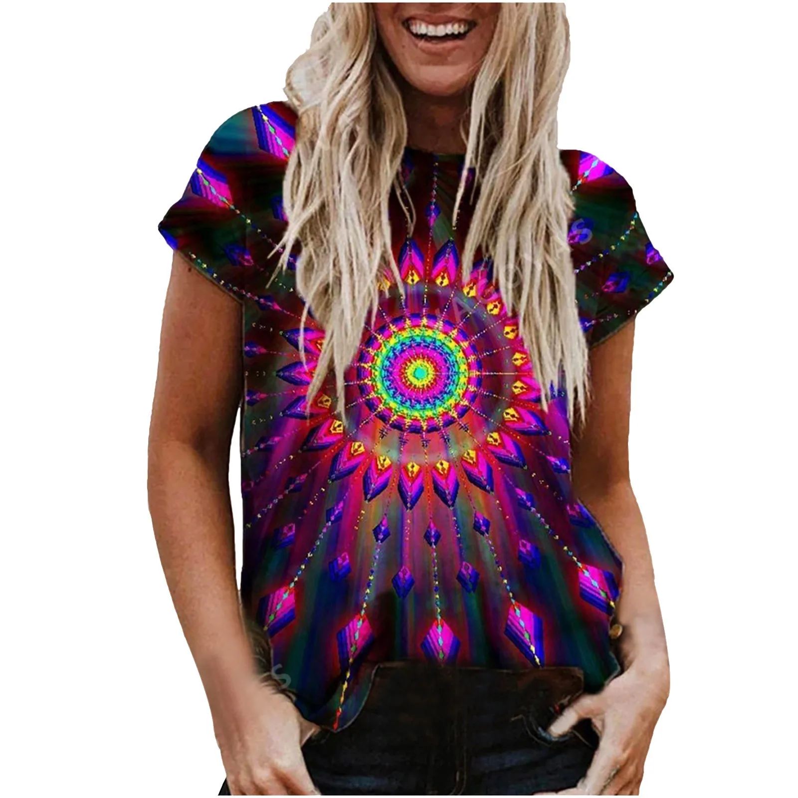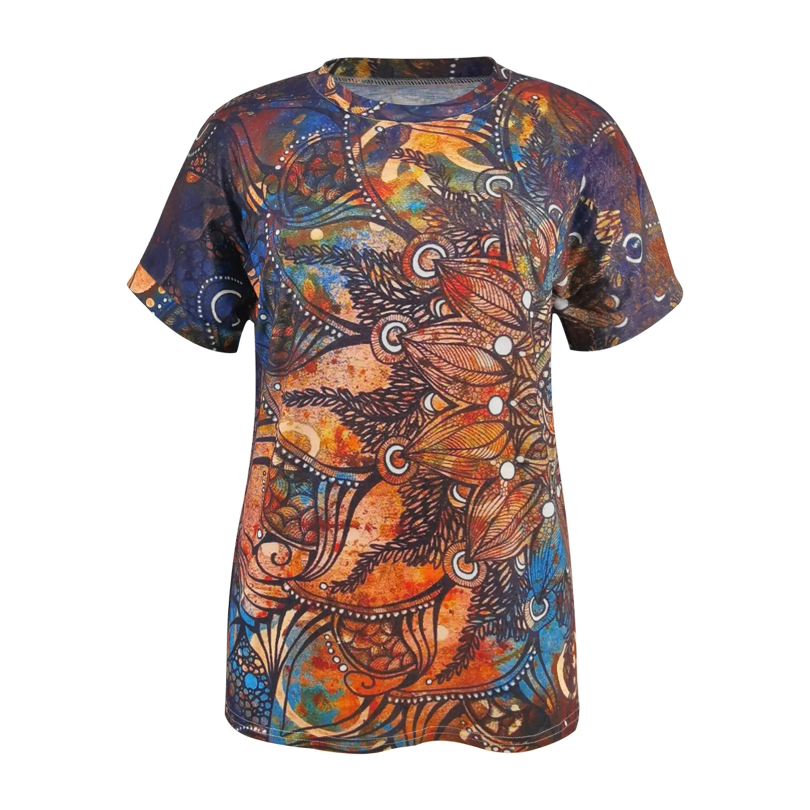 Женская футболка в стиле бохо, повседневный топ в стиле ретро с коротким рукавом и круглым вырезом, летний Свободный Топ с коротким рукавом